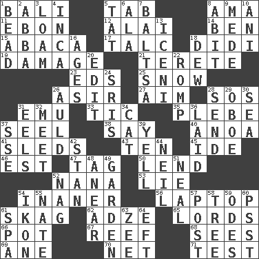 ACROSS 1. Indonesian resort city 5. Bar bill 8. Nursemaid (var.) 11. Inky black, to poets 12. Mountain range southwest of Kyrgyzstan 14. Benjamin's nick name 15. Phillipine bananalike plant 17. Baby powder 18. "You Light Up My Life" star Conn 19. Break 21. Cylindrical with tapered ends 23. Begley and Asner 25. Overwhelm 26. SW Saudi Arabia district 27. Direct toward a target or goal 28. Mayday 31. Australian flightless bird 33. Nervous spasm 35. First-year military academy student 37. Stitch closed the eyes of (a falcon) 38. Declare 40. Small Philippine buffalo 41. Bobsleighs 43. "___ Little Indians" 45. Binary compound 46. Eastern Standard Time (abbr.) 47. Label 50. Grant temporary use of 52. Grandmother 53. Whopper 54. Sillier 56. Portable computer 61. Heroin 62. Axlike tool, used for shaping wood 65. Titled peers of a realm 66. Plant holder 67. Coral ridge 68. Perceives with the eye 69. One (Scot) 70. Fish or hair follower 71. Trial DOWN 1. Necklace unit 2. Swedish rock group 3. Rich soil 4. South American Indian 5. Make lace 6. Wing 7. Greek mezzo-soprano Agnes 8. "This won't hurt ____!" 9. Ancient Persian 10. Black tropical American cuckoo 13. Ancient Celtic tribe of eastern Britain 16. Matures 18. Morning condensation 20. Prepare for publication 22. Play 24. Indian titles of respect 26. Old (Scot.) 28. Post 29. Mitch Miller's instrument 30. Ocean 31. Snakelike fish 32. Rendezvous 34. Domesticated feline 36. Put down 37. Compass dir. 39. Shout 42. Comedian Laurel of Laurel & Hardy 44. Famous astronaut Armstrong 48. Approach 49. Place where plants grow 51. Anneal 52. Tired old horse 54. Visual representation of an object 55. Nathan's nickname 57. Mail 58. Woody plant 59. Lyric poems 60. Inconspicuous attention getter 61. Health resort 63. Last letter of the English alphabet 64. Lizard (obsolete)