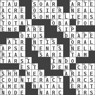 ACROSS 1. The 19th letter of the Greek alphabet 4. Fly high 8. Johnson of "Laugh-In" 12. 43,560 square feet 14. Flexible twig of a willow tree 16. Actress Patricia 17. Play the lead 18. Wine waiters 20. Add up to 22. Chief or king in Benin or Nigeria 23. Enemy 24. Compass dir. 25. "We ___ not amused" (Victoria) 28. Small drink 30. Amu Darya 31. Window treatment 35. Atmosphere 37. Nuclear Threat Initiatives 40. Spoken 41. Domed church section 42. Portable shelters 44. 1994 drama film starring Jodie Foster 45. Monetary unit of Yemen 46. Indian skirt 47. Scottish cap 48. Tarsus (plural) 50. _ china 52. Eastern Standard Time (abbr.) 54. Fenced enclosure 55. Small bed 58. Quiet! 61. Modern: prefix 63. Get up 65. Frustrate 70. Arches 71. So be it 72. Relating to or accompanying birth 73. Part of Q.E.F. 74. Thickened enlargement 75. Drug cop 76. Big collection agency DOWN 1. Clothes sense 2. Gambison 3. A salt of uric acid 4. Distress signal 5. Bear (Spanish) 6. Direct toward a target or goal 7. San ____ (Riviera town) 8. Black tropical American cuckoo 9. Coral collection 10. Pacific island yam 11. Otherwise 13. Period 15. Confederate soldiers (slang) 19. Put down 21. Not strict 26. The smallest animal of a litter 27. _____ Park, CO 29. Right away 30. Threatening words 32. Length times width 33. Inside of hand 34. Pipe bend 35. Capital of Western Samoa 36. Austrian river, tributary to the Danube 38. _ tizzy (2 wds.) 39. Long narrow piece of something 41. Nonscientific branch of learning 43. Trig term 49. Is not 51. Heredity factor (abbr.) 53. Adolescent 55. High-altitude cloud 56. Motion picture award 57. Trials 58. Examine minutely or intensely 59. Like (prefix) 60. Became colored 62. NW Algerian seaport 64. Actress Charlotte 66. Compass dir. 67. "One Day ___ Time" 68. 4-wheeled motor vehicle 69. Affectionate concern, for short