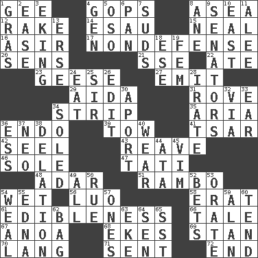 ACROSS 1. Unit of force equal to gravity 4. Republicans 8. At sea 12. Immoral or dissolute person 14. Son of Isaac 15. Be tempered by heat 16. SW Saudi Arabia district 17. Unrelated to defense, as in spending 20. Elected reps. 21. Compass dir. 22. Had dinner 23. Honkers 27. Send forth 29. Opera by Verdi 31. Be footloose 34. Empty completely 35. Roberta Peters solo 36. Inside; within (prefix) 39. Pull behind 41. Russian ruler of old 42. Stitch closed the eyes of (a falcon) 43. Rob, plunder, or pillage 46. Flatfish 47. Jacques of French films 48. The sixth month of the Jewish calendar 51. Role for Stallone 54. Dripping 56. Nilotic language 58. Part of Q.E.F. 61. The property of being fit to eat 66. Falsehood 67. Small Philippine buffalo 68. Supplements with great effort 69. Comedian Laurel of Laurel & Hardy 70. Long (Scottish) 71. Posted 72. Conclusion DOWN 1. Pate de foie ____ 2. Relaxation 3. Supplementing with great effort 4. Commissioned military rank (abbr.) 5. Bear (Spanish) 6. Baking dish 7. Beer foam 8. A saturated hydrocarbon 9. Elected representatives 10. 90 degrees 11. Toward shelter 13. Celtic language 18. Compass dir. 19. Opposite of masc. 24. Consume 25. Title for a knight 26. Prepare for publication 28. Feeling or showing extreme anger 30. To the left, to Queeg 32. By way of 33. Hearing organ 34. Having a sole or soles 36. Curvy letter 37. Modern: prefix 38. Accusation by an informer 40. Put on (as clothing) 44. "One Day ___ Time" 45. Zeal 49. 100% 50. Sorrow 52. Stakes 53. Speak pompously 54. Welt 55. Pulitzer Prize-winning author Ferber 57. Washington bills 59. ____ Jay Lerner 60. Be inclined (to) 62. Paper or plastic container 63. Make supply last 64. Elected rep. 65. Fast jet (abbr.)