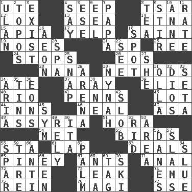 ACROSS 1. Shoshoni 4. Ooze 8. Russian ruler of old 12. Brine-cured salmon 13. At sea 14. Inactive volcano in Sicily 15. Capital of Western Samoa 17. Sharp bark 18. Virtuous person 19. Olfactory organs 21. Cleo's killer 23. Portuguese money of account (variant) 24. Constricts 26. Greek goddess of the dawn 28. Nanny 30. Modes 34. Had dinner 37. Like ___ of sunshine 39. Writer Wiesel 40. River (Sp.) 41. Actor Sean's family 43. Car dealer's back yard 44. Lodging establishments 46. Be tempered by heat 47. White ___ sheet 48. Nineveh was its capital 51. Israeli folk dance 54. Was introduced to 55. Avian creatures 58. R.R. building 61. Infant locale 63. Allots cards 65. Abounding in pines 67. Pismires 71. Of or related to the anus 72. Johnson of "Laugh-In" 73. Path through which fluid escapes 74. Australian flightless bird 75. It's straight from the horse's mouth 76. Wise men 77. Compass dir. DOWN 1. Uhlan (variant) 2. Traditional theme or motif 3. Have an existence 4. Declare 5. Compass dir. 6. Snakelike fish 7. Dad 8. Beverage made from leaves 9. Use a spoon 10. Singer Murray 11. Assign a rank or rating to 16. Age 18. Blemish 20. Health resort 22. Perceive with the eye 25. Fastener 27. A female animal or person 29. Sports stadium 30. Non-adult bird? 31. Spanish pot 32. "Vaya con ____" 33. Stalk of a moss capsule 34. Roberta Peters solo 35. Airtight sealed metal containers 36. Immeasurably long periods of time 38. One (Scot) 42. Oscar Madison type 45. Symbol (abbr.) 49. Depend 50. Call ___ day 52. To free from 53. Type of rug 56. Natives or inhabitants of Denmark 57. Shuts with force 58. Coast Guard woman 59. Hoop that covers a wheel 60. Opposed to 62. Inside of hand 64. Turn sharply 66. Car or cant ending 68. Teachers' org. 69. Label 70. What Jean-Claude Killy likes to do
