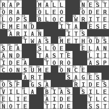 ACROSS 1. Strike 4. Promenade 8. Egg locale 12. Mouth or opening 13. Butter sub 14. River in Europe 15. Chops off 17. Coalition 18. Compose 19. Make improvements or corrections to 21. Call ___ day 23. Compass dir. 24. Believer in; advocate of (suffix) 26. ___ a Wonderful Life 28. It was, poetically 30. Modes 34. Ocean 37. _ gin 39. Flair 40. Added to 41. Clothes sense 43. Cards in a Roman deck? 44. The main thing one is thinking about 46. "Corrida" creature 47. Viper 48. Ingest 51. At one time in the past 54. Tate display 55. Gurus 58. Order of Saint Francis (abbr.) 61. Girls' org. (abbr.) 63. Amusement-park features 65. Country estate 67. Prejudice 71. Filth; sediment 72. Writer Wiesel 73. Assistant 74. Affectionate concern, for short 75. Make mention of 76. Event that recurs at intervals 77. Fast jet (abbr.) DOWN 1. Hero or heavy, e.g. 2. Scent 3. Some stationery 4. Crowd into 5. Everything 6. Lion 7. Locales 8. And not 9. Singer Brickell 10. Arranges properly for use 11. Family _ (genealogy) 16. In a ____ (agitated or irritated) 18. Electrical Unit 20. Simpleton 22. Standoff 25. Political cartoonist Thomas 27. A female animal or person 29. Chalkboard 30. Paris' subway 31. Spanish pot 32. Raised platform 33. Sever or remove by pinching or nipping 34. Ketch in the Levant 35. Inside; within (prefix) 36. Arabian gulf 38. Bear (Spanish) 42. Immeasurably long periods of time 45. White ___ sheet 49. Capital and largest city of Mongolia 50. Mountains (abbr.) 52. 4-wheeled motor vehicle 53. Armor plate that protects the chest 56. Prepares for publication 57. Makes a sale 58. Baking chamber 59. Grain storage tower 60. Secret move to avoid paying debts 62. Blind as ____ 64. Religious group 66. Area sheltered from the wind 68. One more than two 69. Find the sum of 70. Perceive with the eye