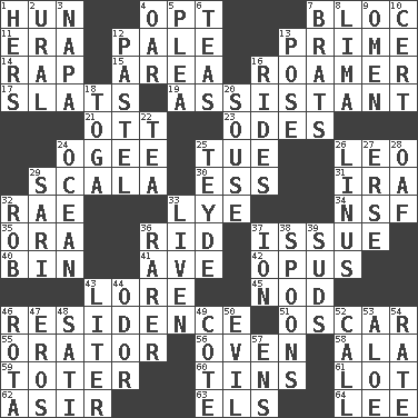 ACROSS 1. Attila the _ 4. Choose 7. Alliance 11. Period 12. Diluted with white 13. First class 14. Strike 15. Type of rug 16. Wanderer 17. Narrow boards 19. Helper 21. Baseball player Mel 23. Lyric poems 24. Double curve, resembling the letter S 25. Third day of the wk. 26. Lion 29. Any of the three canals of the cochlea 30. Double-curved letter 31. Lyricist Gershwin 32. Actress Charlotte 33. Sodium hydroxide 34. Overdraft (abbr.) 35. Mouth or opening 36. To free from 37. Come out of 40. Storage container 41. "___ Maria" 42. Musical composition 43. Old wives' tales, e.g. 45. Allow head to fall sleepily 46. Home 51. Witty Wilde 55. Speaker 56. Baking chamber 58. In the manner of 59. Carrier 60. Airtight sealed metal containers 61. Car dealer's back yard 62. SW Saudi Arabia district 63. Raised railways 64. Area sheltered from the wind DOWN 1. Possessive pronoun 2. Mountain range 3. California wine valley 4. Boat paddle 5. Entreaty 6. Afternoon social gatherings 7. Naughty children 8. Pale green bean 9. Sign of something about to happen 10. Sure thing 12. Soft color 13. Airs 16. Amusement-park features 18. Ancient Roman robe 20. Boozer 22. Afternoon social gathering 24. Sea 25. Miss Universe 1986, Barbara Palacios _ 26. "_ and Lucy" (Charlie Brown theme song) 27. Celtic language 28. Clumsy lout 29. Indian skirt 32. Director Reiner 33. Make or become more lively 36. More uncommon 37. Electrically charged atom 38. Soup utensils 39. Soap bubbles 43. 61 cubic inches 44. Scent 46. Roll call or roster of names 47. Greek god of love 48. Suttee (variant) 49. ____ d'Azur (French Riviera) 50. Morally bad or wrong 52. Give a ring to 53. Medicinal plant 54. Assign a rank or rating to 57. Followers of ems