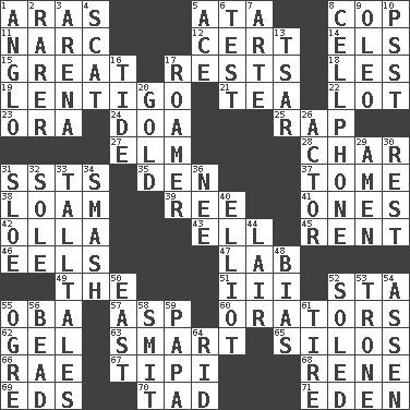 ACROSS 1. Caspian sea tributary 5. _ moment's notice (2 wds.) 8. Police officer (slang) 11. Drug cop 12. Sure thing 14. Raised railways 15. Relatively large 17. Musical pauses 18. French article 19. Small, flat, pigmented spot on the skin 21. Afternoon social gathering 22. Car dealer's back yard 23. Mouth or opening 24. ___ good deed 25. Strike 27. Shade tree 28. Burn to charcoal 31. Fast planes 35. Lair 37. Heavy book 38. Rich soil 39. Portuguese money of account (variant) 41. Washington bills 42. Water jar 43. Pipe bend 45. Monthly bill 46. Snakelike fish 47. Experiment locale 49. Definite Article 51. One more than two 52. R.R. building 55. Chief or king in Benin or Nigeria 57. Cleo's killer 60. Speakers 62. Set 63. Don Adams' spy role 65. Grain storage towers 66. Actress Charlotte 67. Native american tent (variation) 68. French philosopher Descartes 69. Begley and Asner 70. Bit 71. Paradise DOWN 1. White American of non-Hispanic descent 2. More uncommon 3. Sports stadium 4. Leave at once 5. Adept person 6. Trial 7. Johnson of "Laugh-In" 8. Portable communications device 9. Margarine 10. Inconspicuous attention getter 13. Russian ruler of old 16. Periodic rise and fall of the sea level 17. Wanderer 20. Gilt 26. Thespian 29. So be it 30. State of inaction 31. A type of plum 32. Flatfish 33. Baron Munchausen's specialties 34. Box-office sellout 36. Born 40. American author Paul (1891-1958) 44. Den 48. Prejudice 50. Compass direction 52. Having a sole or soles 53. Marketplace scale 54. NE Netherlands city 55. Legendary monster 56. Necklace unit 58. Stricken, poetically 59. Dad 61. Become fatigued 64. To free from