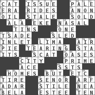ACROSS 1. Domesticated feline 4. Come out of 9. Light colored 13. Epoch 14. Amusement-park features 15. At once, immediately (arch.) 16. Lubricate 17. Having lost freshness 18. Disposed of to a purchaser 19. Chicken ___ king 21. Supplement with great effort 22. Rhinal 24. Airtight sealed metal containers 26. Single 27. Sadhe (variant) 29. Downhill vehicle 30. An arm off of a larger body of water 31. Pale green bean 33. Wind 36. Sliced dessert 37. Rending 40. R.R. building 41. ___ a Wonderful Life 42. Scram, to a cat 43. Fertile tracts in a desert 45. Municipality 47. A-one 48. Adept person 49. Fast planes 50. Dwellings 52. With the exception that 54. And so on (abbr.) 56. Become fatigued 57. Sir (Sp.) 59. Sandy's bark 61. The sixth month of the Jewish calendar 62. Vertical member of a panel or frame 63. Teachers' org. 64. Actor Lugosi 65. First name in cosmetics 66. Nine, plus one DOWN 1. Corporate head (abbr.) 2. Operatic vocal solo 3. Baron Munchausen's specialties 4. Big collection agency 5. Settings 6. Neighbor of Neb. 7. Ubangi River tributary 8. Compass dir. 9. Went by 10. Small Philippine buffalo 11. Hang loosely or laxly 12. Conclusion 20. Helper 22. Pitcher Ryan 23. A saturated hydrocarbon 25. Remaining after all deductions 27. Native american tent (variation) 28. In a ____ (agitated or irritated) 29. Stricken, poetically 31. Made of lace 32. Lyricist Gershwin 33. Helper 34. A distinct part 35. Raze (variant) 38. _____ Park, CO 39. Republicans 44. Johnson of "Laugh-In" 45. Device for capturing images 46. Frozen water 49. Fur scarf 50. Flintstone garb 51. Of the mouth 52. Stakes 53. A single undivided whole 55. Algonquian 56. Keyboard key 57. Compass dir. 58. To riddle 60. Avid follower