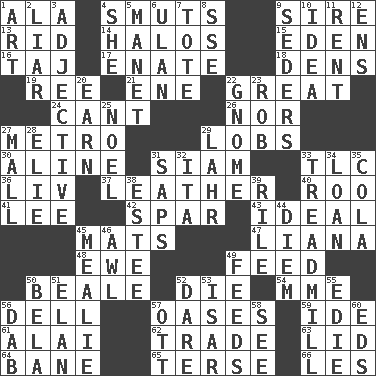 ACROSS 1. Insect wing 4. Particles of soot 9. The founder of a family 13. To free from 14. Saint headwear 15. Genesis locale 16. _ Mahal 17. Maternal 18. Habitations of wild animals 19. To sift 21. Compass dir. 22. Relatively large 24. Patter 26. Or not 27. Paris' subway 29. Tennis shots 30. Place in a line 31. Thailand, formerly 33. Affectionate concern, for short 36. 54 in ancient Rome 37. Cordwainer's material 40. Friend of Pooh 41. Area sheltered from the wind 42. Practice fight 43. Perfect 45. Floor coverings 47. Woody, climbing, usually tropical plant 48. She-sheep 49. Nourish 50. Calif. Air Force Base 52. Pass on 54. Madame (abbr.) 56. Small valley 57. Fertile tracts in a desert 59. Binary compound 61. Mountain range southwest of Kyrgyzstan 62. Exchange 63. Hat (slang) 64. Object of repulsion 65. Laconic 66. French article DOWN 1. Nonscientific branch of learning 2. One who doesn't tell the truth 3. Descriptive word 4. A female animal or person 5. French painter Edouard 6. ____ Bator 7. Carryall 8. Compass dir. 9. Spring feasts 10. It may be bright or harebrained 11. Monthly bill 12. Followers of ems 20. Merit 22. Dwarf 23. Director Reiner 25. Christmas carol 27. Shopping center 28. Writer Wiesel 29. Cowardly lion portrayer 31. Plant excrements 32. Call ___ day 33. Excercise machine 34. Grant temporary use of 35. Root beer relative 38. First name in cosmetics 39. Cause heat under the collar 44. South Vietnam president (1954) 45. Ear of corn 46. Leather borer 49. Eats 50. Actor Lugosi 51. Liveliness 52. Have the gumption 53. Austrian river, tributary to the Danube 55. Singer Brickell 56. Small moist lump or mass 57. Baseball player Mel 58. Perceive with the eye 60. Begley and Asner