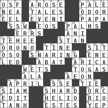 ACROSS 1. Order of Saint Francis (abbr.) 4. Came up 9. Light colored 13. Teachers' org. 14. Falsehoods 15. Scent 16. Snakelike fish 17. Happening 18. Dad 19. Compass dir. 21. Greek goddess of the dawn 22. Insides of hands 24. Blunders 26. Cuckoo 27. Giggle 29. Comedian Laurel of Laurel & Hardy 30. U. of Maine site 31. Prong on a fork 33. Be seated 36. Bear (Spanish) 37. Catching in a trap 40. Compass dir. 41. Directed 42. Blind as ____ 43. N. Chile seaport 45. Soaks 47. Ancient Roman robes 48. Wing 49. Period of immesurable duration 50. Showery time 52. Compass dir. 54. Make a knot 56. Thailand, formerly 57. Broken piece 59. The grampus (Milton) 61. Prepare for publication 62. Sun: prefix 63. _ de Janeiro 64. Hyperbolic tangent 65. _____ Park, CO 66. Slangy assent DOWN 1. Single 2. Perceives with the eye 3. It jiggles the polygraph 4. Had dinner 5. All-night dance parties 6. Margarine 7. Elected reps. 8. Eastern Standard Time (abbr.) 9. Cotton for raincoats, e.g. 10. First man 11. Chops off 12. Epoch 20. Songbird 22. Eucharist need 23. Santa ___, CA 25. Vintage cars 27. Implement 28. Celtic language 29. In a ____ (agitated or irritated) 31. Bar bills 32. Retirement account (abbr.) 33. Signiory (variant) 34. South American Indian 35. Beverages made from leaves 38. Brizilian seaport 39. Yard entry 44. Carrot, for example 45. Heat 46. Connecticut Ivy Leaguer 49. Nest on high 50. Opera by Verdi 51. Ache 52. "______ My Girl" (Turtles hit) 53. Table seasoning 55. One of the Great Lakes 56. Put into a specified state 57. A female animal or person 58. Two (Sp.) 60. Police officer (slang)