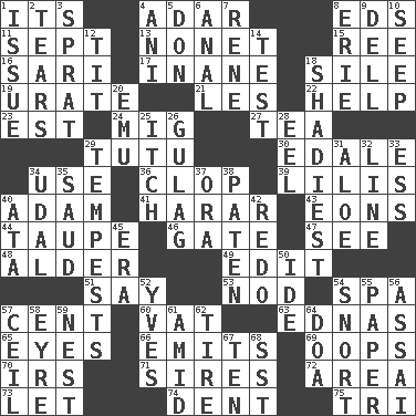 ACROSS 1. It is 4. The sixth month of the Jewish calendar 8. Begley and Asner 11. Back-to-school mo. 13. Music written for nine 15. To riddle 16. Indian skirt 17. Empty; void 18. Filth; sediment 19. A salt of uric acid 21. French article 22. Assist 23. Eastern Standard Time (abbr.) 24. Russian fighter aircraft 27. Beverage made from leaves 29. Ballerina skirt 30. Peak District village in England 34. Purpose 36. Hoof sound 39. Ms. Damita and namesakes 40. First man 41. Ethiopian city, capital of Harari 43. Immeasurably long periods of time 44. Grayish beige 46. Yard entry 47. Observe 48. Tree or shrub in the Birch family 49. Prepare for publication 51. Declare 53. Allow head to fall sleepily 54. Health resort 57. Penny 60. Large container 63. Ferber et al. 65. Snake ____ (dice throw) 66. Gives off 69. I made a mistake 70. Big collection agency 71. Male parents of animals 72. Type of rug 73. Allow 74. Scratch 75. Three (prefix) DOWN 1. Come out of 2. Separates forcefully 3. Small fatty European fish 4. Black tropical American cuckoo 5. Spanish title 6. Of or related to the anus 7. French philosopher Descartes 8. 4th largest of the Great Lakes 9. Small valley 10. Ooze 12. Teat (slang) 14. Trial 18. Most questionable 20. Australian flightless bird 25. Hankering 26. Russian prison camp 28. Snakelike fish 29. Storms 31. Medicinal plant 32. Actor's bit 33. Double-curved letter 34. Freehold land 35. Saudi Arabian king (1953-1964) 37. Mouth or opening 38. Eucharist need 40. "One Day ___ Time" 42. Redecorate 45. Period 50. Binary compound 52. Jacques Cousteau's middle name 54. Derisive sound 55. Some stationery 56. Slender Brazilian palm 57. To provide with a ceiling 58. Jane of fiction 59. Egg locale 61. Among 62. Become fatigued 64. ___ good deed 67. "___ Little Indians" 68. Fast jet (abbr.)