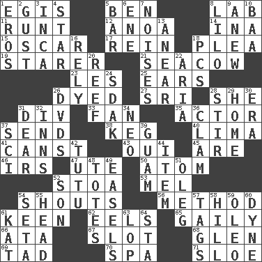 ACROSS 1. The front part of a cuirass 5. Benjamin's nick name 8. Experiment locale 11. Undersized animal 12. Small Philippine buffalo 14. _ tizzy (2 wds.) 15. Witty Wilde 17. It's straight from the horse's mouth 18. Entreaty 19. A viewer who gazes fixedly 21. Manatee 23. French article 25. Hearing organs 26. Colored 27. Indian title of respect (Mr.) 28. A female animal or person 31. HTML Container Element 33. Air blower 35. Thespian 37. Transmit 38. Barrel 40. Pale green bean 41. 2nd pers. sing. pres. of can (arch.) 43. Fr. "Yes" 45. "We ___ not amused" (Victoria) 46. Big collection agency 47. Shoshoni 50. Smallest unit of an element 52. Portico 53. Cartoonist voice _ Blanc 54. Yells 56. Mode 61. Peachy ____! 62. Snakelike fish 65. Lightheartedly 66. "One Day ___ Time" 67. Narrow, elongated depression 68. Small, secluded valley 69. Small boy 70. Health resort 71. _ gin DOWN 1. Greek god of love 2. Abrupt rush of wind 3. South American Indian 4. Play the lead 5. Oblong piece of solid material 6. Compass dir. 7. Annoying sounds 8. _ and Stitch 9. Afresh 10. Sound made by sheep 13. Approach 16. Have confidence or faith in 18. Personal Computers (abbr.) 20. Coral ridge 22. Operatic vocal solo 24. Neighbor of Neb. 26. Movie discs 28. Agitate 29. Dwelling 30. Period 31. Letter starter 32. Lodging establishments 34. Modern: prefix 36. Burrowing marine mollusk 37. _-fi 39. Island territory of the United States 42. Ballerina skirt 44. Detail 48. Hauls 49. Artist's stands 51. Cassini of fashion 52. Boy, to dad 54. Stalk of a moss capsule 55. Froth on beer 57. Labels 58. Land elevation 59. Butter sub 60. Unit of force 61. Krazy ___ of comics 63. Chop off 64. R.R. building