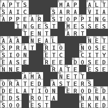 ACROSS 1. Flats, for short 5. Atlas unit 8. Keyboard modifier key 11. Ketch in the Levant 12. "Two Mules for Sister ____" 13. By way of 14. Seem 17. Constricting 19. Eat 21. Makes clutter 22. Portable shelter 23. Tate display 24. American Automobile Association (abbr.) 27. Anneal 29. Fish or hair follower 32. Small fatty European fish 34. River (Sp.) 36. Characteristic smell of wine 37. The Jewish people; Israel 38. And so on (abbr.) 39. Municipality 40. Comfort 41. To sift 42. Administered medicine 43. Compass dir. 44. Pace 46. Compass dir. 47. Nanny (var.) 50. Remaining after all deductions 52. Spoke pompously 55. Michaelmas daisies 57. Accusation by an informer 59. Worn away 62. Begley and Asner 63. Round or rotation of duties 64. Grandmother 65. "Barney Miller" actor Jack 66. Eastern Standard Time (abbr.) 67. Made supply last DOWN 1. White ___ sheet 2. Infant food 3. Native american tent (variation) 4. Odor 5. Floor covering 6. Scent 7. Some stationery 8. Deliberation 9. Actor's bit 10. Labels 12. Fast jet (abbr.) 15. Rep 16. French philosopher Descartes 18. Pacific Standard Time (abbr.) 20. A viewer who gazes fixedly 24. NE Netherlands city 25. Bee-related 26. Came up 28. 61 cubic inches 29. Annoying sound 30. _____ Park, CO 31. Miss Universe 1986, Barbara Palacios _ 33. A saturated hydrocarbon 35. Seas 36. Non-commissioned officer (abbr.) 42. Prevent from occurring 45. False hair 47. "One Day ___ Time" 48. Distance measurement (Brit.) 49. Goodbye (Sp.) 51. Marketplace scale 52. Lyric poems 53. Redecorate 54. In addition 55. Santa ___, CA 56. Neighbor of Neb. 58. Baseball player Mel 60. Compass dir. 61. June honoree
