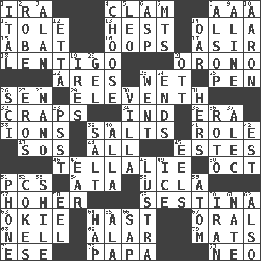 ACROSS 1. Retirement account (abbr.) 4. Dollar (slang) 8. American Automobile Association (abbr.) 11. Lacquered or enameled metalware 13. Behest 14. Spanish pot 15. Blind as ____ 16. I made a mistake 17. SW Saudi Arabia district 18. Small, flat, pigmented spot on the skin 21. U. of Maine site 22. Ancient Greek god of war 23. Dripping 25. Writing instrument 26. Elected rep. 29. Veterans Day date 32. Dice game 34. Working for oneself (abbr.) 35. Epoch 38. Charged atoms 39. Table seasonings 41. Hero or heavy, e.g. 43. Mayday 44. Everything 45. _____ Park, CO 46. Copy Pinocchio 50. Sep. follower 51. Personal Computers (abbr.) 54. "One Day ___ Time" 55. Southern CA. univ. 57. Home run 59. French poetic form 63. Migrant worker of the '30s 64. Vertical spar for supporting sails 67. Relating to the mouth 68. 1994 drama film starring Jodie Foster 69. Having or resembling wings 70. Floor coverings 71. Compass dir. 72. Dad 73. Modern: prefix DOWN 1. Slanted text style (abbr.) 2. Loose flowing garment 3. ____ Jay Lerner 4. Elect 5. Lion 6. Cleo's killer 7. Mountains (abbr.) 8. Columnist Joseph or Stewart 9. Place in a line 10. Composer Copland 12. Singer James 14. Boat paddle 19. Angers 20. Set 21. Baseball player Mel 23. Gone 24. Conclusions 26. _-fi 27. Greek god of love 28. Billionth: prefix 30. Country residence 31. Possessive pronoun 33. Inconspicuous attention getter 36. Printing process, for short 37. Actor Baldwin 39. Table seasoning 40. Silent film actress Nazimova 42. Eastern Standard Time (abbr.) 45. Snakelike fish 47. Ewer handle 48. A period of five years 49. Frozen water 51. Give a jingle 52. Popular sodas 53. Grin 56. Smallest unit of an element 58. Snakelike fish 60. SW Asia republic 61. Nathan's nickname 62. In addition 64. Atlas unit 65. Wing 66. Plant excrement