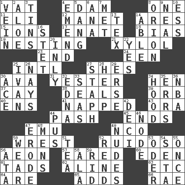ACROSS 1. Large container 4. Dutch treat 8. Single 11. Biblical high priest 12. French painter Edouard 14. Ancient Greek god of war 15. Charged atoms 17. Related on the mother's side 18. Prejudice 19. Nestling 21. Xylene (variant) 23. Conclude 24. Car or cant ending 25. International (abbr.) 27. "______ My Girl" (Turtles hit) 30. Actress Gardner 31. Last past 34. Layer 37. Island 38. Allots cards 39. Globe 40. Followers of ems 41. Slept 43. Mouth or opening 44. Romantic infatuation 45. Extremities 47. Australian flightless bird 49. Non-commissioned officer (abbr.) 50. Obtain by seizing forcibly or violently 52. Noisy, rowdy, vocal (Spanish) 56. Age 57. Having ears or earlike features 60. Paradise 61. Small amounts or degrees 62. Place in a line 63. And so on (abbr.) 64. "We ___ not amused" (Victoria) 65. Sums up 66. Actress Charlotte DOWN 1. Distinctive style or manner 2. Medicinal plant 3. Metal containers 4. Make improvements or corrections to 5. Mild oath, euphamism for damn 6. Santa ___, CA 7. Was introduced to 8. Greek mythologigal hunter 9. Anneal 10. Double-curved letter 13. John Ritter's dad 14. Competent 16. Proofreading order 20. In an inward manner 22. Affirmative reply 25. "Terrible" tsar 26. Negative votes 27. Staphylococcus 28. Assist 29. Celtic language 30. Adept person 32. Pulitzer Prize-winning author Ferber 33. Oceans 34. Parka part 35. Blunders 36. Basketball assoc. 42. Tenth: prefix 44. Festering 46. Thickened enlargement 47. Eat (away) 48. Not women's 49. Unadorned figures 50. Erode 51. Beverage made from leaves 52. Tear apart 53. River in Europe 54. Stalk of a moss capsule 55. At one time in the past 56. _ moment's notice (2 wds.) 58. Wing 59. To free from