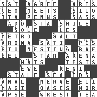 ACROSS 1. Fast jet (abbr.) 4. Match 9. Ancient Greek god of war 13. Corporate head (abbr.) 14. Confronts 15. Grain storage tower 16. Call ___ day 17. Actor Sean's family 18. Backtalk 19. Find the sum of 21. R.R. building 22. Grin 24. Flatfish 26. French article 27. Paris' subway 29. Table seasoning 30. Odor 31. Suttee (variant) 33. Personal Computers (abbr.) 36. _ de Janeiro 37. Snuggling 40. Actress Charlotte 41. Snakelike fish 42. Play the lead 43. Sports stadium 45. Floor protectors 47. Trials 48. She-sheep 49. Painter Guido (1575-1642) 50. Having lost freshness 52. Ocean 54. Begley and Asner 56. Of or related to the anus 57. Boldness 59. Connecticut Ivy Leaguer 61. Wise men 62. Fertile tracts in a desert 63. And not 64. Domed church section 65. Take or capture by force 66. Afternoon social gathering DOWN 1. _-fi 2. Stalk of a moss capsule 3. Inedible or poisonous agaric 4. Electrical Unit 5. Honkers 6. Monthly bill 7. Inactive volcano in Sicily 8. Curvy letter 9. Aid 10. Monetary unit of Yemen 11. Otherwise 12. Mayday 20. Dormintory (informal) 22. Killed 23. Cartoonist voice _ Blanc 25. Grant temporary use of 27. Female horse 28. 4th largest of the Great Lakes 29. Use a swizzle stick 31. Fast planes 32. _ moment's notice (2 wds.) 33. Elected leader of a country 34. Patter 35. Oceans 38. First name in cosmetics 39. Yard entry 44. French philosopher Descartes 45. Ear of corn 46. Leather borer 49. All-night dance parties 50. Fastener 51. Labels 52. Shrivel 53. Celtic language 55. A type of plum 56. Wet nurse (var.) 57. At this time 58. Eastern Standard Time (abbr.) 60. Retirement account (abbr.)