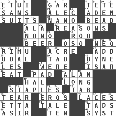 ACROSS 1. Needle holder 5. Slender fish 8. False hair 12. Without 13. Actor Baldwin 15. Arabian gulf 16. Costumes for special activities 18. Billionth: prefix 19. Necklace unit 20. Wing 22. Thinks logically 24. Words to Nanette 26. Friend of Pooh 27. Fermented drink made from hops 28. Bear (Spanish) 29. Modern: prefix 32. Tall New Zealand timber tree 35. 43,560 square feet 37. Increase 38. Allodial 39. Small boy 40. Centimeter-gram-second unit of force 41. French article 42. Past tense of be (plural) 43. Austrian river, tributary to the Danube 44. Consume 45. Groovy apt. 46. Actor Alda or Thicke 49. Actor Linden 50. Protracted 51. Paper fasteners 55. Bar bill 56. Lacerate 57. Greek god of love 59. Shoestrings 63. Singer James 64. Story 65. Small boys 66. SW Saudi Arabia district 67. "___ Little Indians" 68. System (abbr.) DOWN 1. Double-curved letter 2. The 19th letter of the Greek alphabet 3. Corn or form start 4. Byzantium, centuries later 5. Separate the seeds from cotton 6. Having or resembling wings 7. French philosopher Descartes 8. Off limits 9. Genesis locale 10. Afternoon social gatherings 11. Conclusion 14. Unrefined 17. _ gin 21. A saturated hydrocarbon 23. "Barney Miller" actor Jack 25. Declaimed 28. Severe or trying experience 29. Negative votes 30. Pulitzer Prize-winning author Ferber 31. River in Europe 32. General guideline 33. It may be bright or harebrained 34. Vertical spar for supporting sails 36. Auto 40. Empty-headed or silly people 42. Place for singles 45. Infant food 47. Car dealer's back yard 48. Of or related to the anus 49. Ethiopian city, capital of Harari 51. Puts into a specified state 52. Jacques of French films 53. Part of Q.E.F. 54. Flatfish 56. Beverage made from leaves 58. Elected rep. 60. Island 61. Begley and Asner 62. Fast jet (abbr.)