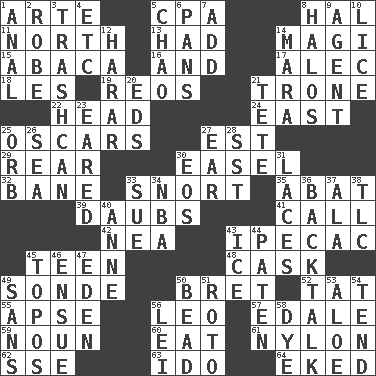 ACROSS 1. Johnson of "Laugh-In" 5. Accounting whiz (abbr.) 8. Actor Linden 11. Compass direction 13. Possessed 14. Wise men 15. Phillipine bananalike plant 16. Also 17. Actor Baldwin 18. French article 19. Vintage cars 21. Heavy duty weighing machine 22. Froth on beer 24. Compass direction 25. Motion picture awards 27. Eastern Standard Time (abbr.) 29. Rump 30. Artist's stand 32. Object of repulsion 33. Derisive sound 35. Blind as ____ 39. Applies to a surface 41. Give a ring to 42. Teachers' org. 43. Medicinal drug used to evoke vomiting 45. Adolescent 48. Keg 49. Message 50. Cy Young winner Saberhagen 52. Make lace 55. Domed church section 56. Lion 57. Peak District village in England 59. Part of speech 60. Consume 61. High-strength synthetic material 62. Compass dir. 63. Wedding promise 64. Supplemented with great effort DOWN 1. Of or related to the anus 2. Loose flowing garment 3. File 13 4. And so on (abbr.) 5. US Secretary of Labor Elaine L. _ 6. Baking dishes 7. Say or write further 8. Radiant circles of light 9. Rep 10. Louse (plural) 12. Ethiopian city, capital of Harari 14. Hindu Mythology: god of death 20. Begley and Asner 21. Wig 23. Having ears or earlike features 25. Globe 26. Ocean 27. Ewer handle 28. Fast jet (abbr.) 30. Greek goddess of the dawn 31. Shoestrings 33. Take to court 34. Basketball assoc. 36. Sass 37. Wing 38. Affectionate concern, for short 40. Queen of England 1702-14 43. Frozen water 44. Eucharist need 45. Traditional theme or motif 46. Follow as a consequence or result 47. Paradise 49. Without 50. Necklace unit 51. Printing process, for short 53. _ vera 54. Watch over 56. Luau accessory 58. Color