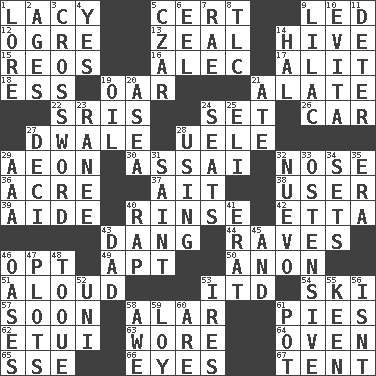 ACROSS 1. Made of lace 5. Foregone conclusion 9. Directed 12. Legendary monster 13. Ardor 14. Hub of activity 15. Vintage cars 16. Actor Baldwin 17. Came down and settled, as after flight 18. Curvy letter 19. Boat paddle 21. Having winglike extensions 22. Indian titles of respect 24. Put into a specified state 26. 4-wheeled motor vehicle 27. A sleeping potion; an opiate (poet.) 28. Ubangi River tributary 29. Period of immesurable duration 30. Slender Brazilian palm 32. Olfactory organ 36. Land measure 37. Small island 38. One who makes use of a thing 39. Assistant 40. Remove soap 42. Singer James 43. Mild oath, euphamism for damn 44. All-night dance parties 46. Choose 49. Fitting 50. At once, immediately (arch.) 51. Verbally 53. It would 54. What Jean-Claude Killy likes to do 57. Within a short period 58. Having or resembling wings 61. Sliced desserts 62. Needle holder 63. Had on 64. Baking chamber 65. Compass dir. 66. Snake ____ (dice throw) 67. Portable shelter DOWN 1. Old wives' tales, e.g. 2. Eons 3. What you're doing now 4. It is so 5. Russian ruler of old 6. Snakelike fish 7. Actress Charlotte 8. Affectionate concern, for short 9. Pale purple color 10. Webber/Rice musical 11. Prevent from occurring 14. Actor Linden 19. Petroleum 20. At sea 21. Had dinner 23. Indian princess (variant) 24. Theater features 25. Biblical high priest 27. Tenth: prefix 28. Exploiting 29. American Automobile Association (abbr.) 31. Inhabitant of Heaven 32. New (sp.) 33. Clearly or manifestly demonstrative 34. Puts into a specified state 35. Period 40. Reproach for some lapse or misdeed 41. Part of Q.E.F. 43. June honoree 45. Added to 46. Fertile tracts in a desert 47. Secret plans 48. Woman's close-fitting hat 52. Corn or form start 53. Angers 55. Peachy ____! 56. Is not 58. Deep reverence 59. Myrna of the movies 60. "We ___ not amused" (Victoria) 61. Plant holder