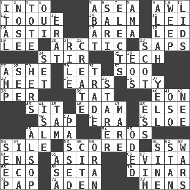 ACROSS 1. To the inside or interior of 5. At sea 9. Leather borer 12. Woman's close-fitting hat 14. Lip ointment 15. Flowery wreath 16. Moving about 17. Type of rug 18. Directed 19. Area sheltered from the wind 20. Northern region 23. Plant excrements 24. Disorderly outburst 25. Technical 27. American tennis player Robert 30. Allow 32. "Barney Miller" actor Jack 33. Confront 34. Hearing organs 36. Filthy place 38. For each 39. Make lace 40. Age 43. Be seated 46. Dutch treat 48. Otherwise 49. Plant excrement 51. Epoch 52. _ gin 53. _ mater 54. Greek god of love 56. Filth; sediment 58. Tallied 61. Compass dir. 64. Followers of ems 65. SW Saudi Arabia district 66. Webber/Rice musical 68. Environmental prefix 69. Stalk of a moss capsule 70. Middle Eastern gold or silver currency 71. Infant food 72. Arabian gulf 73. Not women's DOWN 1. Slanted text style (abbr.) 2. Olfactory organ 3. Carry 4. Fr. "Yes" 5. Blind as ____ 6. Indian skirt 7. Opts 8. Nursemaid (var.) 9. Assad's deity 10. Shed a tear 11. Hats (slang) 13. Part of Q.E.F. 21. Cause heat under the collar 22. Cause to be 23. Native of Scotland 24. Arrange properly for use 26. Greek goddess of the dawn 27. Electrical Unit 28. Perceive with the eye 29. Possessive pronoun 31. Barter 35. A viewer who gazes fixedly 37. Shout 41. Bear (Spanish) 42. Born 44. Small island 45. Scottish cap 47. Female horse 48. Curvy letter 50. Went by 53. Columnist Joseph or Stewart 55. Wrote a lyric poem 56. Ooze 57. South American Indian 59. Quote 60. NW Algerian seaport 61. Trig term 62. Comedian Laurel of Laurel & Hardy 63. Armed conflicts 65. White ___ sheet 67. Zeal