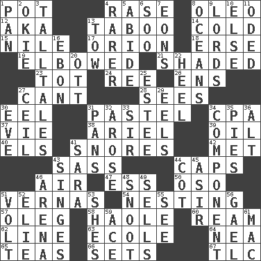 ACROSS 1. Cooking vessel 4. Raze (variant) 8. Margarine 12. Alias (abbr.) 13. Off limits 14. Lacking warmth 15. The longest river in the world 17. Constellation of myth 18. Celtic language 19. Turned at an angle; bent 21. Cast a shadow over 23. Small child 24. To riddle 26. Followers of ems 27. Patter 28. Observes 30. Snakelike fish 31. Soft color 34. Accounting whiz (abbr.) 37. Compete 38. Satellite of Uranus 39. Petroleum 40. Raised railways 41. Sounds asleep 42. Was introduced to 43. Backtalk 44. Balmoral and tarboosh 46. Atmosphere 47. Double-curved letter 50. Bear (Spanish) 51. Actresses Bloom and Felton 54. Inhabiting a nest 57. Cassini of fashion 58. White Person, in Hawaii 60. 480, 500 or 516 sheets of paper 62. Actor's bit 63. Learning spot: Fr. 64. Teachers' org. 65. Beverages made from leaves 66. Puts into a specified state 67. Affectionate concern, for short DOWN 1. Baking dish 2. Migrant worker of the '30s 3. Baron Munchausen's specialties 4. Less widely known 5. Stay 6. "Barney Miller" actor Jack 7. Immeasurably long periods of time 8. Seas 9. Nobles 10. Otherwise 11. Wrote a lyric poem 13. Pull behind 16. Inky black, to poets 20. Baseball player Mel 22. The bottom of a shoe or boot 25. First name in cosmetics 27. To provide with a ceiling 29. Snakelike fish 30. First lady 31. Baking dishes 32. Came up 33. Title for a knight 34. Part 35. Sliced desserts 36. The first octave above the treble staff 41. "Two Mules for Sister ____" 43. Scorches 44. Small bed 45. SW Saudi Arabia district 46. Sports stadium 48. Snout, nose 49. Exchanges for money 51. Electrical Unit 52. Writer Wiesel 53. "______ My Girl" (Turtles hit) 55. Perceive with the eye 56. Highlander 59. Adept person 61. Big _