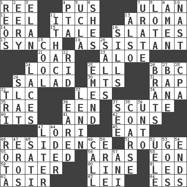 ACROSS 1. Portuguese money of account (variant) 4. Fluid product of inflammation 7. Uhlan (variant) 11. Snakelike fish 12. Hankering 13. Odor 14. Mouth or opening 15. Story 16. Chalkboards 17. Synchronize (abbr.) 19. Aide 21. Rowing implement 23. Medicinal plant 24. Event scenes 25. Pipe bend 26. English channel? 29. First course 30. Mountains (abbr.) 31. Hit sharply and swiftly 32. Affectionate concern, for short 33. French article 34. Santa ___, CA 35. Actress Charlotte 36. Car or cant ending 37. Snake scale 40. ___ a Wonderful Life 41. Added to 42. Immeasurably long periods of time 43. Australian parrot (variant) 45. Ingest 46. Home 51. Makeup applied to the cheeks 55. Declaimed 56. Caspian sea tributary 58. Period of immesurable duration 59. Carrier 60. Actor's bit 61. Directed 62. SW Saudi Arabia district 63. Luau accessory 64. Double-curved letter DOWN 1. Vintage cars 2. Suggestive of the supernatural 3. Style 4. Parent Teacher Assoc. 5. Southern CA. univ. 6. "______ My Girl" (Turtles hit) 7. A salt of uric acid 8. Globular water bottle used in Asia 9. So be it 10. Political cartoonist Thomas 12. New York city 13. In addition 16. Beverly of Met fame 18. Calm and collected 20. Table seasonings 22. To free from 24. Shoestrings 25. Make improvements or corrections to 26. Naughty children 27. Object of repulsion 28. Accounting whiz (abbr.) 29. Narrow board 32. Three (prefix) 33. Soviet premier 1918-24 36. Having ears or earlike features 37. Perceive with the eye 38. Rough 39. To (old English) 43. 61 cubic inches 44. Baltic tributary 46. Roll call or roster of names 47. Greek god of love 48. Suttee (variant) 49. Give a ring to 50. One of the Great Lakes 52. Ubangi River tributary 53. Travels 54. Conclusions 57. Cuckoo