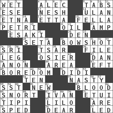 ACROSS 1. Soggy 4. Actor Baldwin 8. Bar bills 12. Compass dir. 13. Delicate 14. ____ Bator, Mongolia 15. Inactive volcano in Sicily 17. Singer James 18. Chap (slang) 19. _ dish (used to culture cells) 21. Lubricate 23. Electrical Unit 24. 1973 Nobel Price Winner (Physics) Leo 26. Lair 28. Stalk of a moss capsule 30. The distance a bow sends an arrow 34. Indian title of respect (Mr.) 37. Russian ruler of old 39. Do some clerical work 40. Part of a journey 41. Flexible twig of a willow tree 43. One of the 12 tribes of Israel 44. Soon (poet.) 46. Type of rug 47. Lizard (obsolete) 48. Mood resulting from idleness 51. "You Light Up My Life" star Conn 54. "___ Little Indians" 55. Smutty 58. Fast jet (abbr.) 61. ___ Haven, CT 63. Vital fluid 65. Derisive sound 67. _ the terrible 71. Needle case 72. Native american tent (variation) 73. _ and Stitch 74. "We ___ not amused" (Victoria) 75. Broke a traffic law 76. Letter starter 77. Directed DOWN 1. Shed a tear 2. First name in cosmetics 3. Portable shelters 4. One (Scot) 5. Allow 6. Eastern Standard Time (abbr.) 7. US Secretary of Labor Elaine L. _ 8. Third day of the wk. 9. Silent film actress Nazimova 10. Lip ointment 11. Fastener 16. Ancient river in northeast Turkey 18. Soared 20. Mamie's husband 22. Wedding promise 25. "Tell ____ the Marines!" 27. Science/research agcy. 29. Indian state 30. A special lineage 31. Flintstone garb 32. Norwegian king 33. Portable shelter 34. Thick slice 35. Former U.S. Attorney General Janet 36. Composer Stravinsky 38. Atmosphere 42. Water falling in drops from the sky 45. Fish or hair follower 49. Incision 50. Single 52. Pat or tap gently 53. Capri or Wright 56. Add up to 57. You are 58. Fast planes 59. Clip 60. Drink excessively 62. Uncontrolled 64. Passed on 66. To free from 68. Compete 69. Wing 70. Not either