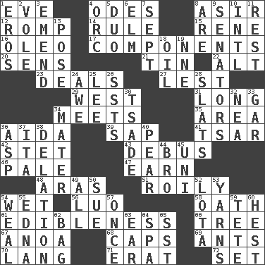 ACROSS 1. First lady 4. Lyric poems 8. SW Saudi Arabia district 12. Frolic 14. Court order 15. French philosopher Descartes 16. Butter sub 17. Pieces 20. Elected reps. 21. Shallow baking pan 22. The first octave above the treble staff 23. Allots cards 27. For fear that 29. Compass direction 31. Yearn 34. Confronts 35. Type of rug 36. Opera by Verdi 39. Plant excrement 41. Russian ruler of old 42. Proofreading order 43. To get out of a bus 46. Light colored 47. Merit 48. Caspian sea tributary 51. Turbulent 54. Dripping 56. Nilotic language 58. Pledge 61. The property of being fit to eat 66. Woody plant 67. Small Philippine buffalo 68. Balmoral and tarboosh 69. Pismires 70. Long (Scottish) 71. Part of Q.E.F. 72. Put into a specified state DOWN 1. Greek god of love 2. Grand slam 3. Make improvements or corrections to 4. The grampus (Milton) 5. Superhero pair 6. Shade tree 7. Back-to-school mo. 8. "We ___ not amused" (Victoria) 9. Legislators 10. International (abbr.) 11. State of inaction 13. Airs 18. Petroleum 19. Compass dir. 24. Deep reverence 25. Area sheltered from the wind 26. Fast planes 28. Narrow boards 30. Sadhe (variant) 32. Teachers' org. 33. Slender fish 34. Mother 36. Viper 37. Call ___ day 38. Accusation by an informer 40. Lightbulb-shaped fruit 44. Sis' sibling 45. University (slang) 49. 100% 50. Take to court 52. Globular water bottle used in Asia 53. Tall tales 54. Welt 55. Pulitzer Prize-winning author Ferber 57. At one time in the past 59. Wig 60. Command 62. Container for groceries 63. Ewer handle 64. Health resort 65. Fast jet (abbr.)