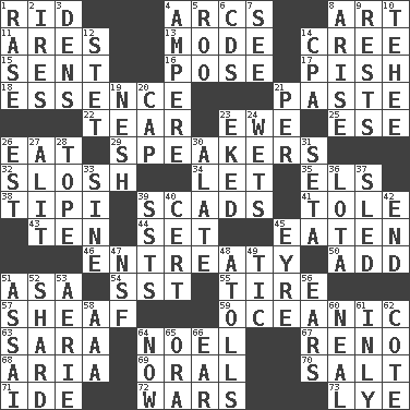 ACROSS 1. To free from 4. Curves 8. Tate display 11. Ancient Greek god of war 13. Method 14. Algonquian 15. Posted 16. Airs 17. Expression of disdain 18. Gist 21. Thick mixture 22. Rend 23. She-sheep 25. Compass dir. 26. Ingest 29. Orators 32. Make a splashing sound 34. Allow 35. Raised railways 38. Native american tent (variation) 39. Tons 41. Lacquered or enameled metalware 43. "___ Little Indians" 44. Put into a specified state 45. Consumed 46. Plea 50. Find the sum of 51. White ___ sheet 54. Fast jet (abbr.) 55. Hoop that covers a wheel 57. Bundle of cut stalks of grain 59. Pertaining to the sea 63. "Two Mules for Sister ____" 64. Christmas carol 67. Western Nevada city 68. Roberta Peters solo 69. Taken by mouth 70. Table seasoning 71. Binary compound 72. Armed conflicts 73. Potassium hydroxide DOWN 1. To erase 2. Angers 3. Lairs 4. Electrical Unit 5. Friend of Pooh 6. Music discs 7. Perceive with the eye 8. Originate 9. Musical pauses 10. Giggle 12. Proofreading order 14. Tax preparer (abbr.) 19. Delicate 20. Head covering 21. For each 23. Supplemented with great effort 24. Moistens 26. Eastern Standard Time (abbr.) 27. Set down 28. Drink excessively 30. Having winglike extensions 31. Bristle 33. Trig term 36. Globular water bottle used in Asia 37. Downhill vehicle 39. Fast planes 40. Certainty 42. Conclusion 45. Jane of fiction 47. Science/research agcy. 48. Ringlike coral islands and reefs 49. Nervous spasm 51. Slender Brazilian palm 52. Pottery fragment 53. Nest on high 56. Hearing organs 58. American Automobile Association (abbr.) 60. Anneal 61. In an inward manner 62. ____ d'Azur (French Riviera) 64. Immediately 65. Mouth or opening 66. Hearing organ