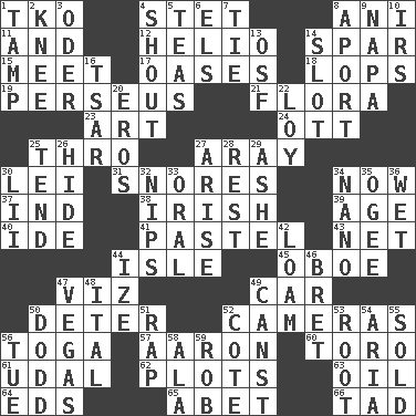 ACROSS 1. Ring climax 4. Proofreading order 8. Cuckoo 11. Also 12. Sun: prefix 14. Practice fight 15. Rendezvous 17. Fertile tracts in a desert 18. Chops off 19. Son of Zeus who helped slay Medusa 21. Plants 23. Tate display 24. Baseball player Mel 25. Through, poetically 27. Like ___ of sunshine 30. Flowery wreath 31. Sounds asleep 34. Immediately 37. Working for oneself (abbr.) 38. From or relating to Ireland 39. Mature 40. Binary compound 41. Soft color 43. Fish or hair follower 44. Small island 45. Mitch Miller's instrument 47. To wit 49. 4-wheeled motor vehicle 50. Prevent from occurring 52. Devices for capturing images 56. Ancient Roman robe 57. Composer Copland 60. "Corrida" creature 61. Allodial 62. Secret plans 63. Petroleum 64. Begley and Asner 65. Collude with 66. Small boy DOWN 1. Pack (down) 2. Leg joint 3. Baltic tributary 4. Yell 5. Afternoon social gatherings 6. Raised railways 7. Neckwear 8. To the left, to Queeg 9. California wine valley 10. Big collection agency 13. Order of Saint Francis (abbr.) 14. Slit 16. Russian ruler of old 20. Greek god of love 22. Myrna of the movies 25. Look after 26. Flintstone garb 27. Get up 28. Relief 29. American tennis player Robert 30. Cards in a Roman deck? 32. Cuts off 33. Spoken 34. Billionth: prefix 35. Double curve, resembling the letter S 36. Soggy 42. Rich soil 44. Ending with capital 46. Cy Young winner Saberhagen 47. Viva Las _ 48. Slanted text style (abbr.) 49. 2nd pers. sing. pres. of can (arch.) 50. Texas town _ City 51. Hit sharply and swiftly 52. ____ d'Azur (French Riviera) 53. Carrot, for example 54. Operatic vocal solo 55. Exchanged or delivered for money 56. Third day of the wk. 58. In the manner of 59. Director Reiner