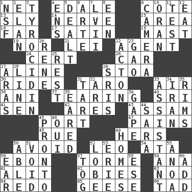 ACROSS 1. Fish or hair follower 4. Peak District village in England 9. ____ d'Azur (French Riviera) 13. Secret 14. Impudent aggressiveness 15. Length times width 16. Distant 17. Smooth fabric 18. Vertical spar for supporting sails 19. Or not 21. Flowery wreath 22. Representative 24. An absolute certainty 26. Automobile 27. Place in a line 29. Portico 30. Amusement-park features 31. Edible starchy tuberous root 33. Wind 36. Cuckoo 37. Rending 40. Indian title of respect (Mr.) 41. Elected rep. 42. Ancient Greek god of war 43. Indian state 45. Sweet dark-red dessert wine 47. Aches 48. Sorrow 49. Possessive pronoun 50. Prevent the occurrence of 52. Lion 54. _ moment's notice (2 wds.) 56. Inky black, to poets 57. Singer Mel 59. Santa ___, CA 61. Set down 62. Off-Broadway awards 63. Lower and raise head in agreement 64. Redecorate 65. Honkers 66. Bit DOWN 1. Science/research agcy. 2. Flair 3. Polypeptide antibiotic 4. Followers of ems 5. Started a card game 6. Johnson of "Laugh-In" 7. 57 in ancient Rome 8. Car or cant ending 9. Device for capturing images 10. NW Algerian seaport 11. Trial 12. Erode 20. French philosopher Descartes 22. NE Massachussets city 23. E Mali city 25. Take ten 27. Caspian sea tributary 28. Actor's bit 29. Indian titles of respect 31. Small pie 32. "We ___ not amused" (Victoria) 33. Aide 34. SW Asia republic 35. Basketball hoops 38. Having ears or earlike features 39. Yawn 44. "Two Mules for Sister ____" 45. Right away 46. Fr. "Yes" 49. Residences 50. Competent 51. Null 52. Ear part 53. 4th largest of the Great Lakes 55. Small Philippine buffalo 56. Hearing organ 57. Coat; cloak 58. Compass dir. 60. Increase