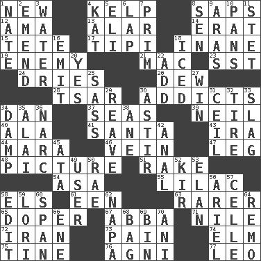 ACROSS 1. ___ Haven, CT 4. Seaweed 8. Plant excrements 12. Nanny (var.) 13. Having or resembling wings 14. Part of Q.E.F. 15. False hair 17. Native american tent (variation) 18. Lacking in sense or substance 19. Foe 21. Apple computer (short form) 23. Fast jet (abbr.) 24. Frees from moisture 26. Morning condensation 28. Russian ruler of old 30. Inveterate users 34. Daniel's nick name 37. Oceans 39. Famous astronaut Armstrong 40. According to 41. Before Barbara or Clara 43. Retirement account (abbr.) 44. Hindu Mythology: god of death 46. Distinctive style or manner 47. Part of a journey 48. Photo 51. Immoral or dissolute person 54. White ___ sheet 55. Pale purple color 58. Raised railways 61. Car or cant ending 63. More valued for its uncommonness 65. Drug addict 67. Swedish rock group 71. Mediterranean tributary 72. SW Asia republic 73. Ache 74. Shade tree 75. Prong on a fork 76. Hindu god of fire 77. Lion DOWN 1. Nathan's nickname 2. Make improvements or corrections to 3. Wetness 4. Krazy ___ of comics 5. Biblical high priest 6. Pet locale 7. Demure 8. Elected rep. 9. Caspian sea tributary 10. Zero-star reviews 11. Proofreading order 16. Give off 18. On the rocks 20. Affirmative reply 22. Increase 25. Backtalk 27. Victory 29. Rob, plunder, or pillage 30. Being in motion 31. To provide with a ceiling 32. Become fatigued 33. Volcanic refuse 34. Moist 35. Mountain range southwest of Kyrgyzstan 36. Drug cop 38. One (Scot) 42. Of or related to the anus 45. "One Day ___ Time" 49. One who makes use of a thing 50. Actress Charlotte 52. Apertif with cassis 53. Enthusiasm 56. Satellite of Uranus 57. Cell (Danish) 58. Prepare for publication 59. Australian parrot (variant) 60. Connect, as a bridge 62. California wine valley 64. San ____ (Riviera town) 66. Compass dir. 68. Container for groceries 69. Storage container 70. Cuckoo