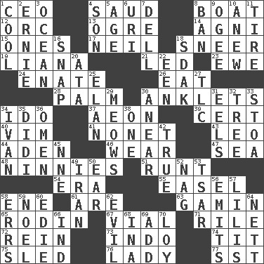 ACROSS 1. Corporate head (abbr.) 4. Saudi Arabian king (1953-1964) 8. Water vessel 12. The grampus (Milton) 13. Legendary monster 14. Hindu god of fire 15. Washington bills 17. Famous astronaut Armstrong 18. Contemptuous expression 19. Climbing, woody, usually tropical vines 21. Directed 23. She-sheep 24. Related on the mother's side 26. Ingest 28. Inside of hand 30. Short socks 34. Wedding promise 37. A really long time 39. An absolute certainty 40. Zeal 41. Music written for nine 43. Lion 44. Arabian gulf 46. Erode 47. Ocean 48. Simpletons 51. Undersized animal 54. Epoch 55. Artist's stand 58. Compass dir. 61. "We ___ not amused" (Victoria) 63. Homeless child 65. "The Thinker" sculptor 67. Small bottle 71. Cause heat under the collar 72. It's straight from the horse's mouth 73. _ china 74. Teat (slang) 75. Downhill vehicle 76. Kenny Rogers chart-topper in '80 77. Fast jet (abbr.) DOWN 1. Calm and collected 2. Bert's buddy 3. Sea 4. Boy, to dad 5. Ripen 6. RI univ. 7. Small valley 8. Forbid 9. Double curve, resembling the letter S 10. Afresh 11. Hoop that covers a wheel 16. Fastener 18. Neighbor of Neb. 20. "One Day ___ Time" 22. Car or cant ending 25. Liveliness 27. Affectionate concern, for short 29. Catcalls? 30. Approach 31. Snakelike fish 32. Relationship diagram 33. Portico 34. _ the terrible 35. "You Light Up My Life" star Conn 36. Presage 38. Single 42. Loyal 45. Compass dir. 49. SW Asia republic 50. Hearing organ 52. Tired old horse 53. Russian ruler of old 56. Gives off 57. Ms. Damita and namesakes 58. Blunders 59. Christmas carol 60. Singer Brickell 62. Morally bad or wrong 64. Remaining after all deductions 66. Working for oneself (abbr.) 68. _ tizzy (2 wds.) 69. Find the sum of 70. Myrna of the movies