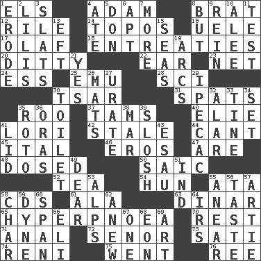 ACROSS 1. Raised railways 4. First man 8. Naughty child 12. Cause heat under the collar 14. Literary convention 16. Ubangi River tributary 17. Norwegian king 18. Pleas 20. Simple song 22. Ewer handle 23. Fish or hair follower 24. Double-curved letter 25. Australian flightless bird 28. _-fi 30. Russian ruler of old 31. Arguments over trivial matters 35. Friend of Pooh 37. Scottish caps 40. Writer Wiesel 41. Australian parrot (variant) 42. Lacking originality or spontaneity 44. Patter 45. Slanted text style (abbr.) 46. Greek god of love 47. "We ___ not amused" (Victoria) 48. Administered medicine 50. Ketch in the Levant 52. Afternoon social gathering 54. Attila the _ 55. _ moment's notice (2 wds.) 58. Music discs 61. In the manner of 63. Middle Eastern gold or silver currency 65. Abnormally rapid or deep breathing 70. Repose 71. Of or related to the anus 72. Sir (Sp.) 73. Suttee (variant) 74. Painter Guido (1575-1642) 75. Gone 76. Portuguese money of account (variant) DOWN 1. Eat (away) 2. Ms. Damita and namesakes 3. Narrow boards 4. Had dinner 5. Spanish title 6. Fitting 7. Greater amount 8. On the contrary 9. It's straight from the horse's mouth 10. Toward shelter 11. Trial 13. Bank Draft (abbr.) 15. Oceans 19. Arches 21. Consenting reply 26. Floor protectors 27. A salt of uric acid 29. Medicinal drug used to evoke vomiting 30. Bathroom 32. Having or resembling wings 33. Prong on a fork 34. Arrange properly for use 35. Printing process, for short 36. Mouths or openings 38. Third mo. 39. Agitate, as a liquid 41. Flaplike covering 43. He sold his birthright 49. Letter starter 51. Indiana (abbr.) 53. High mountains 55. Approach 56. Clothes sense 57. Nick name for Arthur 58. Burn to charcoal 59. Unit of force 60. Connect, as a bridge 62. Afresh 64. Big collection agency 66. Biblical high priest 67. Single 68. Period of immesurable duration 69. Tate display