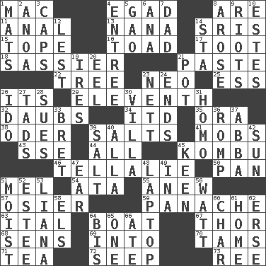 ACROSS 1. Apple computer (short form) 4. Mild oath 8. "We ___ not amused" (Victoria) 11. Of or related to the anus 13. Nanny 14. Indian titles of respect 15. Drink excessively 16. Frog relative 17. A blast of a horn 18. More impudent 21. Thick mixture 22. Woody plant 23. Modern: prefix 25. Double-curved letter 26. It is 29. Veterans Day date 32. Applies to a surface 34. It would 35. Mouth or opening 38. River in Europe 39. Table seasonings 41. Disorderly crowds 43. Compass dir. 44. 100% 45. Dried seaweed eaten as food 46. Copy Pinocchio 50. Baking dish 51. Cartoonist voice _ Blanc 54. _ moment's notice (2 wds.) 55. Afresh 57. Flexible twig of a willow tree 59. Flamboyance 63. Slanted text style (abbr.) 64. Water vessel 67. Son of Odin 68. Elected reps. 69. To the inside or interior of 70. Scottish caps 71. Afternoon social gathering 72. Ooze 73. Portuguese money of account (variant) DOWN 1. Floor coverings 2. Small Philippine buffalo 3. Smile enhancers 4. Main course 5. E Mali city 6. Santa ___, CA 7. June honoree 8. Came up 9. Disturbances 10. _____ Park, CO 12. For fear that 14. R.R. building 19. Angers 20. Snakelike fish 21. Cooking vessel 23. Remaining after all deductions 24. Conclusions 26. Wedding promise 27. Bits 28. Institutes legal proceedings 30. Country estate 31. Like (prefix) 33. Cy Young winner Saberhagen 36. Frolic 37. Swedish rock group 39. Table seasoning 40. Silent film actress Nazimova 42. Player for Phoenix 45. Peachy ____! 47. Ewer handle 48. Portable computer 49. _ tizzy (2 wds.) 51. Damp 52. First name in cosmetics 53. Climbing, woody, usually tropical vines 56. Electrical Unit 58. Raised railways 60. Burn to charcoal 61. Dwelling 62. Celtic language 64. Twice 65. Single 66. Had dinner
