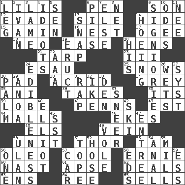 ACROSS 1. Ms. Damita and namesakes 6. Writing instrument 9. Male child 12. Elude 13. Drop; flow; fall 14. Flintstone garb 15. Street urchin 16. A home for chicks 17. Double curve, resembling the letter S 18. Modern: prefix 19. Relaxation 20. Coop moms 21. Canvas cover 23. One more than two 24. He sold his birthright 25. Frozen precipitation (plural) 28. Groovy apt. 30. Sour-tasting 34. Jennifer or Joel 35. Cuckoo 36. Receives possession of 38. ___ a Wonderful Life 39. Ear part 41. Actor Sean's family 43. Eastern Standard Time (abbr.) 44. Promenades 46. Supplements with great effort 48. Raised railways 49. Distinctive style or manner 50. A single undivided whole 51. Son of Odin 53. Scottish cap 56. Butter sub 57. Calm and collected 58. Bert's buddy 60. Political cartoonist Thomas 61. Domed church section 62. Allots cards 63. Followers of ems 64. To riddle 65. Exchanges for money DOWN 1. Part of a journey 2. "Terrible" tsar 3. Unable to walk 4. Foolish or stupid persons 5. Elected rep. 6. Sliced desserts 7. Otherwise 8. Fish or hair follower 9. Seigniories (variant) 10. Lyric poems 11. Born 13. Fastener 14. Weeding 19. Spew [out] 20. Part of HMS, perhaps 22. American Automobile Association (abbr.) 24. The property of being fit to eat 26. Moistens 27. System (abbr.) 28. Inside of hand 29. Small Philippine buffalo 31. Strike 32. Mamie's husband 33. Lair 37. Scornful expression 40. American author Paul (1891-1958) 42. What Jean-Claude Killy likes to do 45. Fast jet (abbr.) 47. Main course 49. Grand slam 50. ____ Bator 51. Drink excessively 52. Flexible conduit 54. Of or related to the anus 55. Place where flour is made 56. Single 57. Automobile 58. Begley and Asner 59. Double-curved letter