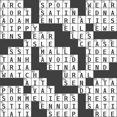 ACROSS 1. Curve 4. Blemish 8. Put on (as clothing) 12. Australian parrot (variant) 14. Smooth fabric 16. Pulitzer Prize-winning author Ferber 17. First man 18. Pleas 20. Likely to tip or tilt 22. Pipe bend 23. She-sheep 24. Followers of ems 25. Ewer handle 28. French article 30. Small island 31. Stop 35. Fast jet (abbr.) 37. Promenade 40. It may be bright or harebrained 41. Hyperbolic tangent 42. Shun 44. Scratch 45. Roberta Peters solo 46. Inactive volcano in Sicily 47. Conclusion 48. Timepiece 50. Mountain range 52. Small island 54. Elected rep. 55. _ moment's notice (2 wds.) 58. Before (prefix) 61. Large container 63. Middle Eastern gold or silver currency 65. Wine waiters 70. Relief 71. Commotion 72. World-weariness 73. Suttee (variant) 74. Jacques of French films 75. Ooze 76. To sift DOWN 1. Having winglike extensions 2. "The Thinker" sculptor 3. Dice game 4. Compass dir. 5. Baking dish 6. Baseball player Mel 7. Hoop that covers a wheel 8. Dripping 9. Singer Brickell 10. Afresh 11. Raze (variant) 13. Naughty child 15. 1994 drama film starring Jodie Foster 19. Actor Baldwin 21. Affirmative reply 26. _ mater 27. Break or tear apart 29. A glass for beer 30. New York city 32. Arabian gulf 33. Transmit 34. Ingest 35. "Two Mules for Sister ____" 36. In a ____ (agitated or irritated) 38. Car dealer's back yard 39. "_ and Lucy" (Charlie Brown theme song) 41. The 23rd letter of the Hebrew alphabet 43. Have the gumption 49. Hub of activity 51. Plus 53. Story 55. Approach 56. Clothes sense 57. Nick name for Arthur 58. Inconspicuous attention getter 59. Round or rotation of duties 60. Send forth 62. Metal containers 64. Big collection agency 66. Medical imaging device (abbr.) 67. Compass dir. 68. Regret 69. Small drink
