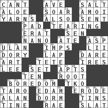 ACROSS 1. Patter 5. "___ Maria" 8. Table seasoning 12. _ vera 13. Fly high 15. Mine, in Marseilles 16. Entertaining tales 18. In addition 19. Posted 20. Groovy apt. 22. Lacerating 24. Part of Q.E.F. 26. Elected rep. 27. Billionth: prefix 28. Had dinner 29. Cleo's killer 32. ____ Bator, Mongolia 35. Naughty children 37. Cards in a Roman deck? 38. Small, narrow, flatbottom fishing boat 39. Pet locale 40. Have the gumption 41. Nonscientific branch of learning 42. Wig 43. Angers 44. Area sheltered from the wind 45. Put into a specified state 46. Tenement units (abbr.) 49. "___ Little Indians" 50. Carrot, for example 51. Mood resulting from idleness 55. Ring climax 56. Pacific island yam 57. Dutch treat 59. Wear away 63. ____ Jay Lerner 64. Dormintory (informal) 65. Canisters 66. Prong on a fork 67. Actress Charlotte 68. Narrow board DOWN 1. Island 2. In the manner of 3. And not 4. 3-inch nail 5. White ___ sheet 6. Electrical Unit 7. Comfort 8. Indian antelope 9. So be it 10. Yearn 11. Teat (slang) 14. Exposes to great heat 17. "Two Mules for Sister ____" 21. Daniel's nick name 23. To separate or throw off 25. Bathroom 28. Become visible 29. Having or resembling wings 30. The founder of a family 31. Sliced desserts 32. Freehold land 33. Old wives' tales, e.g. 34. Johnson of "Laugh-In" 36. Floor covering 40. What propaganda does 42. Watched over 45. Perceive with the eye 47. Cooking vessel 48. Puff or smoke 49. Heavy duty weighing machine 51. Indonesian resort city 52. NW Algerian seaport 53. Aroma 54. Hindu Mythology: god of death 56. Make lace 58. Madame (abbr.) 60. Petroleum 61. Heredity factor (abbr.) 62. Eastern Standard Time (abbr.)