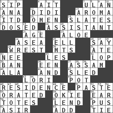 ACROSS 1. Small drink 4. Small island 7. ____ Bator, Mongolia 11. Santa ___, CA 12. "You Light Up My Life" star Conn 13. Odor 14. It would 15. Presage 16. Chalkboards 17. Administered medicine 19. Aide 21. Mature 23. _ vera 24. At sea 25. Pipe bend 26. Declare 29. Obtain by seizing forcibly or violently 30. Mountains (abbr.) 31. Had dinner 32. Born 33. French article 34. Chop off 35. Bar 36. Car or cant ending 37. Indian state 40. Insect wing 41. Also 42. Downhill vehicle 43. Australian parrot (variant) 45. Cooking vessel 46. Dwelling 51. Thick mixture 55. Spoke pompously 56. Migrant worker of the '30s 58. Ewer handle 59. Lugs 60. Grant temporary use of 61. Tenth month of the Hindu calendar 62. SW Saudi Arabia district 63. Find the sum of 64. Make a knot DOWN 1. Expressed in words 2. To the inside or interior of 3. Groovy apts. 4. Direct toward a target or goal 5. It may be bright or harebrained 6. Metal containers 7. A salt of uric acid 8. Globular water bottle used in Asia 9. So be it 10. Political cartoonist Thomas 12. Evades 13. In addition 16. Beverly of Met fame 18. Relaxation 20. Table seasonings 22. Ingest 24. Sports stadium 25. Make improvements or corrections to 26. Vegetable dish 27. Tiny particle 28. Slangy assent 29. Welt 32. Basketball assoc. 33. Soviet premier 1918-24 36. Having ears or earlike features 37. Viper 38. Inclined 39. Bristle 43. 61 cubic inches 44. Lyric poems 46. Round or rotation of duties 47. Greek god of love 48. Suttee (variant) 49. Root beer relative 50. Made supply last 52. Back-to-school mo. 53. "Change" in Tahitian 54. Celtic language 57. Working for oneself (abbr.)