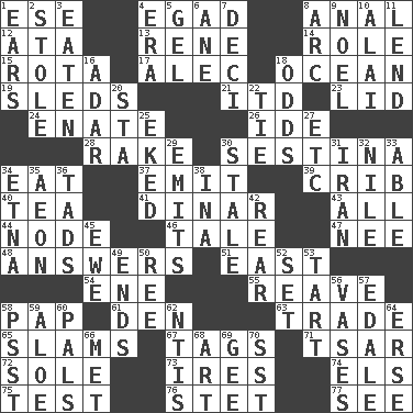 ACROSS 1. Compass dir. 4. Mild oath 8. Of or related to the anus 12. _ moment's notice (2 wds.) 13. French philosopher Descartes 14. Hero or heavy, e.g. 15. Roll call or roster of names 17. Actor Baldwin 18. Sea 19. Bobsleighs 21. It would 23. Flaplike covering 24. Maternal 26. Binary compound 28. Immoral or dissolute person 30. French poetic form 34. Erode 37. Send forth 39. Baby bed with high sides 40. Afternoon social gathering 41. Middle Eastern gold or silver currency 43. Everything 44. Thickened enlargement 46. Falsehood 47. Born 48. Responds (to) 51. Compass direction 54. Compass dir. 55. Rob, plunder, or pillage 58. Infant food 61. Lair 63. Buy and sell 65. Shuts with force 67. Labels 71. Russian ruler of old 72. Flatfish 73. Angers 74. Raised railways 75. Trial 76. Proofreading order 77. Observe DOWN 1. Hearing organs 2. Took without asking 3. Ingested 4. Period 5. Set 6. A saturated hydrocarbon 7. Tenth: prefix 8. Curve 9. Christmas carol 10. Mountain range southwest of Kyrgyzstan 11. Grant temporary use of 16. The sixth month of the Jewish calendar 18. Likelihood 20. R.R. building 22. Standoff 25. Supplemented with great effort 27. And so on (abbr.) 29. Gives off 30. Showing deterioration from age 31. SW Asia republic 32. The longest river in the world 33. Competent 34. Inactive volcano in Sicily 35. Period of immesurable duration 36. Bits 38. _ tizzy (2 wds.) 42. Bring up, as a child 45. She-sheep 49. Conclusions 50. To sift 52. Put into a specified state 53. Small pie 56. Flower holders 57. Peak District village in England 58. Inconspicuous attention getter 59. _ vera 60. Friends 62. Nuclear Threat Initiatives 64. Celtic language 66. Was introduced to 68. Nonscientific branch of learning 69. Unit of force equal to gravity 70. Fast jet (abbr.)