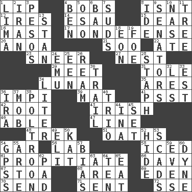 ACROSS 1. Mouth edge 4. Moves up and down 8. Is not 12. Angers 14. Son of Isaac 15. Letter starter 16. Vertical spar for supporting sails 17. Unrelated to defense, as in spending 20. Small Philippine buffalo 21. "Barney Miller" actor Jack 22. Had dinner 23. Contemptuous expression 27. A home for chicks 29. Rendezvous 31. Lacquered or enameled metalware 34. Type of eclipse 35. Ancient Greek god of war 36. Body of Kaffir warriors 39. Floor protector 41. Inconspicuous attention getter 42. Carrot, for example 43. From or relating to Ireland 46. Competent 47. Actor's bit 48. Long journey 51. Curses 54. Slender fish 56. Experiment locale 58. On the rocks 61. Appease 66. _ Jones' Locker 67. Portico 68. Length times width 69. Locale of original sin 70. Transmit 71. Transmitted 72. Compass dir. DOWN 1. Pale green bean 2. SW Asia republic 3. Mexican monetary units 4. Benjamin's nick name 5. Bear (Spanish) 6. Forbid 7. Beer foam 8. Binary compound 9. Elected representatives 10. Political cartoonist Thomas 11. Relationship diagram 13. Comedian Laurel of Laurel & Hardy 18. Age 19. Enemy 24. Australian flightless bird 25. Car or cant ending 26. 480, 500 or 516 sheets of paper 28. Staphylococcus 30. Get behind 32. French article 33. Eastern Standard Time (abbr.) 34. 61 cubic inches 36. Retirement account (abbr.) 37. Crowd into 38. Coward 40. Musical group of three 44. _ tizzy (2 wds.) 45. Put into a specified state 49. Biblical high priest 50. Krazy ___ of comics 52. Flintstone garb 53. Loads 54. Global Positioning Systems (abbr.) 55. Johnson of "Laugh-In" 57. Prejudice 59. Nights before holidays 60. Centimeter-gram-second unit of force 62. Groovy apt. 63. "We ___ not amused" (Victoria) 64. "___ Little Indians" 65. Ingest