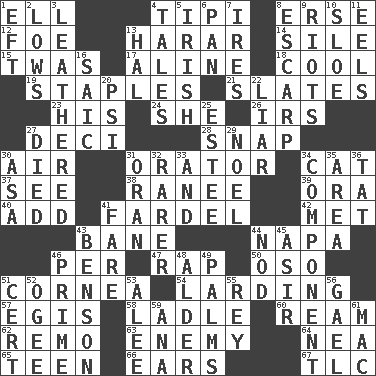 ACROSS 1. Pipe bend 4. Native american tent (variation) 8. Celtic language 12. Enemy 13. Ethiopian city, capital of Harari 14. Filth; sediment 15. It was, poetically 17. Place in a line 18. Calm and collected 19. Paper fasteners 21. Chalkboards 23. Part of HMS, perhaps 24. A female animal or person 26. Big collection agency 27. Tenth: prefix 28. Fastener 30. Wind 31. Speaker 34. Domesticated feline 37. Observe 38. The wife of a rajah (variant) 39. Mouth or opening 40. Say or write further 41. Burden 42. Was introduced to 43. Object of repulsion 44. California wine valley 46. For each 47. Hit sharply and swiftly 50. Bear (Spanish) 51. Pupil covering 54. Preparing or cooking with lard 57. The front part of a cuirass 58. Dipping utensil 60. 480, 500 or 516 sheets of paper 62. San ____ (Riviera town) 63. Foe 64. Teachers' org. 65. Adolescent 66. Hearing organs 67. Affectionate concern, for short DOWN 1. Newt 2. Moos 3. Resembling or made to resemble leather 4. Falsehoods 5. From or relating to Ireland 6. Baking dish 7. Angers 8. Fortification 9. Debaucheries 10. _ gin 11. Snakelike fish 13. Actor Linden 16. Ketch in the Levant 20. 23rd letter of the Greek alphabet 22. One who doesn't tell the truth 25. First name in cosmetics 27. Passed on 29. Christmas carol 30. White ___ sheet 31. NW Algerian seaport 32. More uncommon 33. Also 34. Part 35. Type of rug 36. Make lace 41. Conductor's collection 43. Gillaume's butler role 44. Lower and raise head in agreement 45. SW Saudi Arabia district 46. A-one 48. Tree or shrub in the Birch family 49. Insides of hands 51. An absolute certainty 52. Double curve, resembling the letter S 53. Toward shelter 55. Marina Del _, California 56. Highlander 59. Santa ___, CA 61. Apple computer (short form)