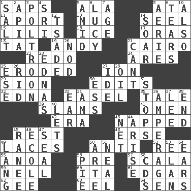ACROSS 1. Plant excrements 5. Chicken ___ king 8. _ moment's notice (2 wds.) 11. To the left, to Queeg 13. Java container 14. Sew up the eyelids of hawks and falcons 15. Ms. Damita and namesakes 16. Frozen water 17. Mouths or openings 18. Make lace 19. "60 Minutes" Commentator Rooney 21. Capital of Egypt 22. Redecorate 24. Ancient Greek god of war 25. Worn away 27. Electrically charged atom 29. The Jewish people; Israel 30. Proofreads 32. Pulitzer Prize-winning author Ferber 33. Artist's stand 35. Lie 39. Shuts with force 41. Sign of something about to happen 42. Epoch 43. Slept 45. Repose 48. Celtic language 49. Shoestrings 50. Against 52. To sift 55. Small Philippine buffalo 56. Before (prefix) 57. Any of the three canals of the cochlea 59. 1994 drama film starring Jodie Foster 60. Call ___ day 61. _ Allan Poe 62. Unit of force equal to gravity 63. Snakelike fish 64. Elected reps. DOWN 1. Table seasoning 2. Capital of Western Samoa 3. Coward 4. Indian title of respect (Mr.) 5. Among 6. "I Love _" 7. Ripen 8. Nest on high 9. Lacerates 10. In addition 12. Sadhe (variant) 14. Fly high 20. Lower and raise head in agreement 21. Patter 23. Ferber et al. 25. Compass dir. 26. To free from 27. Binary compound 28. Petroleum 30. Curvy letter 31. Constricts 33. Hearing organ 34. Nanny (var.) 36. Electrical Measurement 37. Area sheltered from the wind 38. Conclusion 40. Allows 43. Fish or hair follower 44. Get up 45. The wife of a rajah (variant) 46. Learning spot: Fr. 47. Lick closed 49. Austrian-born American filmmaker Fritz 50. Johnson of "Laugh-In" 51. Be tempered by heat 53. Liveliness 54. Hearing organs 56. Sliced dessert 58. Music discs