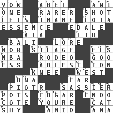 ACROSS 1. Solemn pledge 4. Collude with 8. Black tropical American cuckoo 11. Single 12. Less widely known 14. Opportunity 15. Allows 17. Lacking in sense or substance 18. Globular water bottle used in Asia 19. Gist 21. Peak District village in England 23. "One Day ___ Time" 24. It would 25. Indonesian resort city 27. Old wives' tales, e.g. 30. Or not 31. Fodder prepared in a silo 34. Raised railways 37. Basketball assoc. 38. Cowboy competition 39. Thick or sticky substance 40. Double-curved letter 41. Most capable 43. Electrically charged atom 44. Leg joint 45. 270 degrees 47. Heredity factor (abbr.) 49. Ewer handle 50. Peter (Polish) 52. More lively and spirited 56. Cooking vessels 57. _ Allan Poe 60. Inside; within (prefix) 61. ____ d'Azur (French Riviera) 62. You are 63. Feline 64. Like a shrinking violet 65. Among 66. Housemaid (var.) DOWN 1. Short-tailed, large-bodied rat 2. Singles 3. Soaks 4. N. Chile seaport 5. Object of repulsion 6. Epoch 7. Nine, plus one 8. Hold, grip (Informal) 9. Short letter 10. Call ___ day 13. To sift 14. Narrow board 16. Lick closed 20. Nuclear Threat Initiatives 22. Expire 25. Moves up and down 26. Caspian sea tributary 27. Dipping utensil 28. Double curve, resembling the letter S 29. Vintage cars 30. Compass dir. 32. SW Asia republic 33. Ear part 34. Armor plate that protects the chest 35. Plunder 36. Male child 42. It was, poetically 44. Krazy ___ of comics 46. Celtic language 47. Short, simple song 48. Olfactory organ 49. Having ears or earlike features 50. "Silly old bear" 51. Marina Del _, California 52. Indian skirt 53. South American Indian 54. Dutch treat 55. Round or rotation of duties 56. Personal Computers (abbr.) 58. ___ good deed 59. Chewing product