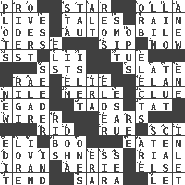 ACROSS 1. Adept person 4. Play the lead 8. Water jar 12. Not recorded 14. Stories 16. Precipitation 17. Lyric poems 18. Form of transportation 20. Laconic 22. Small drink 23. At this time 24. Fast jet (abbr.) 25. Cards in a Roman deck? 28. Third day of the wk. 30. Fast planes 31. Chalkboard 35. Actress Charlotte 37. Writer Wiesel 40. Style 41. "Death on the ____" 42. Haggard of country music 44. A slight indication 45. Mild oath 46. Bits 47. Make lace 48. One who wires 50. Hearing organs 52. To free from 54. Regret 55. _-fi 58. Connecticut Ivy Leaguer 61. Surprise greeting 63. Eroded 65. Innocence, gentleness, or tenderness 70. Monetary unit of Yemen 71. SW Asia republic 72. Nest on high 73. Otherwise 74. Be inclined (to) 75. "Two Mules for Sister ____" 76. Allow DOWN 1. Small pieces of grounds 2. Amusement-park features 3. Unconcealed 4. R.R. building 5. The 19th letter of the Greek alphabet 6. Keyboard modifier key 7. Vintage cars 8. Globe 9. (Had) reclined 10. _ and Stitch 11. Afresh 13. Curvy letter 15. Stricken, poetically 19. Musical composition 21. Raised railways 26. A distinct part 27. Small island 29. Opts 30. Sowing specialist 32. Silent film actress Nazimova 33. Pulled tight 34. Compass dir. 35. Swiss mountan, "Queen of the Mountains" 36. Having or resembling wings 38. Lyricist Gershwin 39. A person who is older than you are 41. ___ Haven, CT 43. He sold his birthright 49. Teases 51. To sift 53. Capital of the state of Qatar 55. Free from disturbance or agitation 56. Desist 57. An arm off of a larger body of water 58. Prepare for publication 59. Old wives' tales, e.g. 60. "Terrible" tsar 62. Washington bills 64. "We ___ not amused" (Victoria) 66. Indiana (abbr.) 67. Epoch 68. Title for a knight 69. Ocean