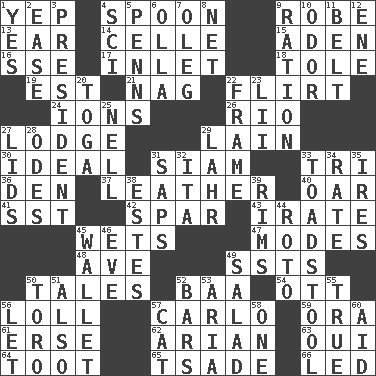 ACROSS 1. Slangy assent 4. Soup utensil 9. Loose flowing garment 13. Ewer handle 14. Cell (Danish) 15. An important port of Yemen 16. Compass dir. 17. An arm off of a larger body of water 18. Lacquered or enameled metalware 19. Eastern Standard Time (abbr.) 21. Tired old horse 22. Talk or behave amorously 24. Charged atoms 26. _ de Janeiro 27. Inn 29. (Had) reclined 30. Perfect 31. Thailand, formerly 33. Three (prefix) 36. Lair 37. Cordwainer's material 40. Boat paddle 41. Fast jet (abbr.) 42. Practice fight 43. Feeling or showing extreme anger 45. Moistens 47. Methods 48. "___ Maria" 49. Fast planes 50. Stories 52. Sound made by sheep 54. Baseball player Mel 56. Hang loosely or laxly 57. Monte _, Las Vegas Hotel/Casino 59. Mouth or opening 61. Celtic language 62. Believer in; advocate of (suffix) 63. Fr. "Yes" 64. A blast of a horn 65. Sadhe (variant) 66. Directed DOWN 1. Affirmative reply 2. Relaxation 3. Elected leader of a country 4. _-fi 5. Actor Sean's family 6. Rounded earthenware pot or jar 7. Cassini of fashion 8. Fish or hair follower 9. Food allowance for one day 10. Aroma 11. Waist strap 12. Compass dir. 20. Ancient Roman robe 22. Movie unit 23. Cards in a Roman deck? 25. 1994 drama film starring Jodie Foster 27. Flaplike coverings 28. Lyric poems 29. Cowardly lion portrayer 31. Plant excrements 32. Call ___ day 33. Inedible or poisonous agaric 34. Assign a rank or rating to 35. Angers 38. _____ Park, CO 39. Basketball hoops 44. Printing process, for short 45. Place for singles 46. Night before a holiday 49. First course 50. "Corrida" creature 51. In addition 52. Taverns 53. Roberta Peters solo 55. Loyal 56. Allow 57. Feline 58. Single 60. Assist