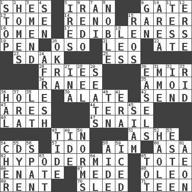 ACROSS 1. "______ My Girl" (Turtles hit) 5. SW Asia republic 9. Yard entry 13. Heavy book 14. Former U.S. Attorney General Janet 15. Less widely known 16. Sign of something about to happen 17. The property of being fit to eat 19. Fenced enclosure 20. Bear (Spanish) 21. Lion 22. Had dinner 23. Neighbor of Neb. 25. Curvy letter 26. Strips of potato fried in deep fat 30. Independent ruler or chieftain 34. The wife of a rajah (variant) 35. Mine, in Marseilles 36. Opening into or through something 39. Having winglike extensions 42. Post 43. Ancient Greek god of war 44. Laconic 46. Thin strip of wood or metal 47. Slow-paced one 48. Shallow baking pan 51. American tennis player Robert 54. Music discs 57. Wedding promise 58. Direct toward a target or goal 60. White ___ sheet 62. Subcutaneous 65. Lug 66. Maternal 67. Ancient Persian 68. Butter sub 69. Monthly bill 70. Downhill vehicle 71. Adolescent DOWN 1. Constrict 2. Residences 3. Make improvements or corrections to 4. Elected rep. 5. Angers 6. Redecorate 7. Black tropical American cuckoo 8. Having high moral qualities 9. Separate the seeds from cotton 10. Type of rug 11. Trial 12. Celtic language 15. Vintage cars 18. French article 20. Gumbo ingredient 24. Anew 27. _ tizzy (2 wds.) 28. Snakelike fish 29. Theater features 30. Artist's stands 31. Madame (abbr.) 32. Electrically charged atom 33. To free from 36. Actor Linden 37. Mouth or opening 38. Allow 40. "___ Little Indians" 41. Epoch 45. Thailand, formerly 48. Event that recurs at intervals 49. Binary compound 50. Typical models 52. White Person, in Hawaii 53. First name in cosmetics 54. "Mermaids" star 55. Centimeter-gram-second unit of force 56. Connect, as a bridge 58. Assistant 59. On the rocks 61. Age 63. Baseball player Mel 64. Cartoonist voice _ Blanc 65. Small child