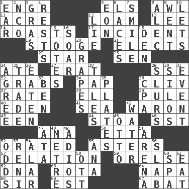 ACROSS 1. Engineer (abbr.) 5. Raised railways 8. Leather borer 11. 43,560 square feet 12. Rich soil 13. Area sheltered from the wind 14. Exposes to great heat 17. Event 19. Moe Howard, for one 21. Chooses 22. Play the lead 23. Elected rep. 24. Had dinner 27. Part of Q.E.F. 29. Compass dir. 32. Takes hold of 34. Infant food 36. 154 in Roman numerals 37. Assign a rank or rating to 38. Pipe bend 39. Whimper 40. Paradise 41. Ocean 42. Make _____ (do battle with) 43. Car or cant ending 44. Portico 46. Fast jet (abbr.) 47. Nursemaid (var.) 50. Singer James 52. Spoke pompously 55. Michaelmas daisies 57. Conveyance 59. Threatening words 62. Heredity factor (abbr.) 63. Round or rotation of duties 64. California wine valley 65. Title for a knight 66. Eastern Standard Time (abbr.) 67. Blind as ____ DOWN 1. Hearing organ 2. Non-commissioned officer (abbr.) 3. Pate de foie ____ 4. Musical pauses 5. Period of immesurable duration 6. Shoestrings 7. Grin 8. Actor Baldwin 9. Left 10. Allows 12. Falsehood 15. Lugs 16. Fly high 18. Lair 20. Raisin fruits 24. Match 25. Buy and sell 26. Consumed 28. Falsehoods 29. Runs notes together 30. Grain storage towers 31. Happening 33. Benjamin's nick name 35. Food holders 36. Accounting whiz (abbr.) 42. Wetness 45. "Beetle Bailey" pooch 47. _ moment's notice (2 wds.) 48. Distance measurement (Brit.) 49. Goodbye (Sp.) 51. Sports stadium 52. Likelihood 53. Painter Guido (1575-1642) 54. Having or resembling wings 55. Santa ___, CA 56. Thick slice 58. Baseball player Mel 60. Health resort 61. Ingest