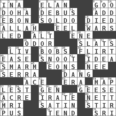 ACROSS 1. _ tizzy (2 wds.) 4. Flair 8. Thick or sticky substance 11. Capital of the state of Qatar 13. Alight from a bus 15. Say or write further 16. Inky black, to poets 17. Twentieth part of a lira 18. Passed on 19. Assad's deity 21. Snakelike fish 22. Armed conflicts 23. Directed 24. The first octave above the treble staff 27. Compass dir. 29. Aroma 30. Narrow boards 34. 54 in ancient Rome 36. Moves up and down 39. Talk or behave amorously 40. Relaxation 41. Snob 43. It may be bright or harebrained 44. Excessive but superficial compliments 46. Immeasurably long periods of time 47. Born 48. Father Junipero _ 49. Mild oath, euphamism for damn 51. Adept person 53. Epoch 54. Atlas unit 57. For fear that 60. Commissioned mil. rank 63. Honkers 65. Land measure 66. Feeling or showing extreme anger 69. Remaining after all deductions 70. Medical imaging device (abbr.) 71. Smooth fabric 72. Use a swizzle stick 73. Ichor 74. Watch over 75. _ Lanka DOWN 1. Perfect 2. Impressive in appearance 3. Hold, grip (Informal) 4. Begley and Asner 5. Lion 6. Competent 7. Unadorned 8. Greek goddess of the earth (variant) 9. River in Europe 10. Likelihood 12. Santa ___, CA 14. Flatfish 18. Home 20. Possessed 25. Tennis shots 26. Marketplace scale 28. Overdraft (abbr.) 29. Make much ado about nothing 31. Assistant 32. Woody plant 33. R.R. building 34. Unable to walk 35. Austrian river, tributary to the Danube 37. Sometimes accompanies a hiss 38. Message 40. Double-curved letter 42. Russian ruler of old 45. Apple computer (short form) 50. Tired old horse 52. The front part of a cuirass 54. Confronts 55. Being in motion 56. _ dish (used to culture cells) 57. Desk light 58. Shade of tan 59. Indian titles of respect 61. Part of Q.E.F. 62. Nathan's nickname 64. Followers of ems 67. Shallow baking pan 68. Conclude