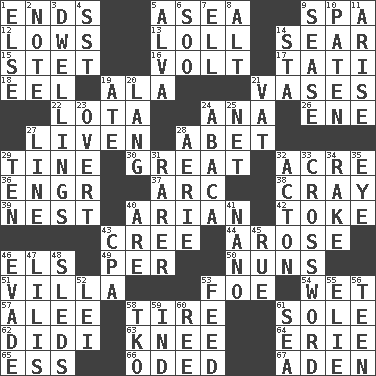 ACROSS 1. Conclusions 5. At sea 9. Health resort 12. Moos 13. Hang loosely or laxly 14. Dry up 15. Proofreading order 16. Electrical Unit 17. Jacques of French films 18. Snakelike fish 19. Insect wing 21. Flower holders 22. Globular water bottle used in Asia 24. Santa ___, CA 26. Compass dir. 27. Make or become more lively 28. Collude with 29. Prong on a fork 30. Relatively large 32. Land measure 36. Engineer (abbr.) 37. Curve 38. Supercomputer manufacturer 39. Egg locale 40. Believer in; advocate of (suffix) 42. Puff or smoke 43. Algonquian 44. Came up 46. Raised railways 49. For each 50. Religious women 51. Country residence 53. Enemy 54. Dripping 57. Toward shelter 58. Hoop that covers a wheel 61. Not divided or shared with others 62. "You Light Up My Life" star Conn 63. Leg joint 64. 4th largest of the Great Lakes 65. Curvy letter 66. Wrote a lyric poem 67. An important port of Yemen DOWN 1. Otherwise 2. Brief written record 3. Homes 4. Fast jet (abbr.) 5. Inventor's middle name 6. "Barney Miller" actor Jack 7. Pipe bend 8. Keyboard modifier key 9. Gospel singer Marvin 10. Eucharist need 11. Get up 14. R.R. building 19. Had dinner 20. Austrian-born American filmmaker Fritz 21. Large container 23. Unconcealed 24. Phillipine bananalike plant 25. Fish or hair follower 27. Actor's bit 28. Nest on high 29. Nine, plus one 31. More uncommon 32. 13-14th century defensive garment 33. What you're doing now 34. Immoral or dissolute person 35. Sight organ 40. "We ___ not amused" (Victoria) 41. Billionth: prefix 43. Tax preparer (abbr.) 45. Sorrow 46. Dodge 47. Ms. Damita and namesakes 48. Bobsleighs 52. Flowery wreath 53. Nourish 55. Writer Wiesel 56. Adolescent 58. Ring climax 59. Working for oneself (abbr.) 60. To separate or throw off 61. Ocean