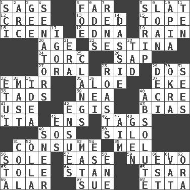 ACROSS 1. Droops 5. At a great distance 8. Narrow board 12. Algonquian 13. Wrote a lyric poem 15. Drink excessively 16. Ancient Celtic tribe of eastern Britain 18. Pulitzer Prize-winning author Ferber 19. Precipitation 20. Grow older 22. French poetic form 24. Torque (variant) 26. Plant excrement 27. Spoken 28. To free from 29. Two (Sp.) 32. Arab leader 35. Medicinal plant 37. Make supply last 38. Bits 39. Teachers' org. 40. 43,560 square feet 41. Purpose 42. The front part of a cuirass 43. Prejudice 44. Call ___ day 45. Followers of ems 46. Labels 49. Mayday 50. Grain storage tower 51. Ingest 55. Cartoonist voice _ Blanc 56. Flatfish 57. Comfort 59. New (sp.) 63. Lacquered or enameled metalware 64. Comedian Laurel of Laurel & Hardy 65. Russian ruler of old 66. Having or resembling wings 67. Take to court 68. Singer James DOWN 1. _-fi 2. Curve 3. Turn to the right 4. Legislators 5. Enemy 6. Sums up 7. French philosopher Descartes 8. Empty completely 9. Grant temporary use of 10. Capital of Western Samoa 11. Nine, plus one 14. Small ungulate mammals of Africa 17. Composer Stravinsky 21. Period 23. Small boy 25. Rigngs loudly 28. Ridicules or criticizes harshly 29. Tenth: prefix 30. Gumbo ingredient 31. Perceives with the eye 32. Needle case 33. Vertical spar for supporting sails 34. It may be bright or harebrained 36. Luau accessory 40. Utter; complete 42. Takes place subsequently 45. Greek goddess of the dawn 47. Direct toward a target or goal 48. Small, secluded valley 49. Contemptuous expression 51. Calm and collected 52. Water jar 53. Floor coverings 54. Son of Isaac 56. R.R. building 58. Compass dir. 60. Eastern Standard Time (abbr.) 61. Large container 62. Mouth or opening