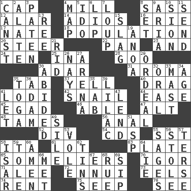 ACROSS 1. Head covering 4. Place where flour is made 8. Backtalk 12. Having or resembling wings 14. Goodbye (Sp.) 16. 4th largest of the Great Lakes 17. Nathan's nickname 18. Census information 20. Bull 22. Baking dish 23. Also 24. "___ Little Indians" 25. _ tizzy (2 wds.) 28. Thick or sticky substance 30. The sixth month of the Jewish calendar 31. Odor 35. Bar bill 37. Shout 40. To be drawn or hauled along 41. Farming town in central California 42. Slow-paced one 44. Relaxation 45. Mild oath 46. Competent 47. The first octave above the treble staff 48. Domesticates 50. Of or related to the anus 52. HTML Container Element 54. Music discs 55. Fast jet (abbr.) 58. Call ___ day 61. Car dealer's back yard 63. Food holder 65. Wine waiters 70. Russian composer Stravinsky 71. Toward shelter 72. World-weariness 73. Snakelike fish 74. Monthly bill 75. Ooze 76. Perceive with the eye DOWN 1. 2nd pers. sing. pres. of can (arch.) 2. Having winglike extensions 3. Eucharist need 4. Atlas unit 5. Wedding promise 6. Mouth edge 7. Central Nebraska county 8. Put into a specified state 9. Roberta Peters solo 10. The Jewish people; Israel 11. Post 13. To sift 15. Volcanic refuse 19. Small Philippine buffalo 21. To free from 26. Negative votes 27. Sports stadium 29. Severe or trying experience 30. Remained 32. Of the mouth 33. Vertical spar for supporting sails 34. Mature 35. Ancient Roman robe 36. First of billions? 38. Experiment locale 39. Pale purple color 41. Allow 43. Grant temporary use of 49. Drop; flow; fall 51. Cleo's killer 53. Short-tailed, large-bodied rat 55. Gurus 56. Fur scarf 57. Laconic 58. Austrian river, tributary to the Danube 59. Lacquered or enameled metalware 60. So be it 62. Metal containers 64. Whopper 66. Was introduced to 67. Compass dir. 68. Sorrow 69. Small drink