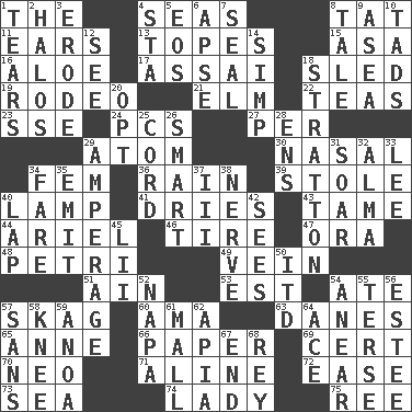 ACROSS 1. Definite Article 4. Oceans 8. Make lace 11. Hearing organs 13. Drinks excessively 15. White ___ sheet 16. Medicinal plant 17. Slender Brazilian palm 18. Downhill vehicle 19. Cowboy competition 21. Shade tree 22. Afternoon social gatherings 23. Compass dir. 24. Personal Computers (abbr.) 27. For each 29. Tiny particle 30. Rhinal 34. Opposite of masc. 36. Precipitation 39. Took without asking 40. Desk light 41. Frees from moisture 43. Docile 44. Satellite of Uranus 46. Hoop that covers a wheel 47. Mouth or opening 48. _ dish (used to culture cells) 49. Distinctive style or manner 51. The 18th letter of the Arabic alphabet 53. Eastern Standard Time (abbr.) 54. Had dinner 57. Heroin 60. Nanny (var.) 63. Natives or inhabitants of Denmark 65. Queen of England 1702-14 66. Some stationery 69. Sure thing 70. Modern: prefix 71. Place in a line 72. Comfort 73. Ocean 74. Kenny Rogers chart-topper in '80 75. To sift DOWN 1. Pulls apart 2. Radiant circles of light 3. Eat (away) 4. R.R. building 5. Greek goddess of the dawn 6. Domed church section 7. Lick closed 8. Story 9. Toward the sea 10. Small boys 12. Observe 14. Simple or foolish person 18. Ski resort town in Vermont 20. Choose 25. Drawstring 26. Don Adams' spy role 28. Followers of ems 29. Electrical Measurement 31. Fly high 32. _ mater 33. Area sheltered from the wind 34. Conductor's collection 35. Give off 37. One more than two 38. Boldness 40. Infant locale 42. Perceives with the eye 45. Cards in a Roman deck? 50. It would 52. California wine valley 54. Approach 55. Laconic 56. First name in cosmetics 57. Without 58. Leg joint 59. Small Philippine buffalo 61. Shopping center 62. Capital of Western Samoa 64. Adept person 67. Conclude 68. Marina Del _, California