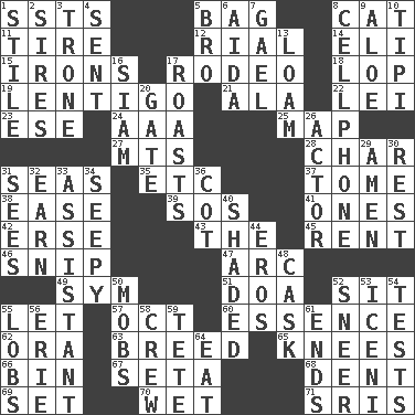 ACROSS 1. Fast planes 5. Container for groceries 8. Feline 11. Become fatigued 12. Monetary unit of Yemen 14. Connecticut Ivy Leaguer 15. Metal shackles 17. Cowboy competition 18. Chop off 19. Small, flat, pigmented spot on the skin 21. Insect wing 22. Luau accessory 23. Compass dir. 24. Auto club (abbr.) 25. Atlas unit 27. Mountains (abbr.) 28. Burn to charcoal 31. Oceans 35. And so on (abbr.) 37. Heavy book 38. Comfort 39. Mayday 41. Washington bills 42. Celtic language 43. Definite Article 45. Monthly bill 46. Sever or remove by pinching or nipping 47. Curve 49. Symbol (abbr.) 51. ___ good deed 52. Be seated 55. Allow 57. Sep. follower 60. Core 62. Mouth or opening 63. A special lineage 65. Leg joints 66. Storage container 67. Bristle 68. Gouge 69. Arrange properly for use 70. Soggy 71. Indian titles of respect DOWN 1. Vertical member of a panel or frame 2. Fathers 3. Marketplace scale 4. Emitted 5. Sis' sibling 6. Opera by Verdi 7. Highlander 8. Portable communications device 9. _ vera 10. Native american tent (variation) 13. Rich soil 16. Thailand, formerly 17. Exposes to great heat 20. Yard entry 26. Thespian 29. So be it 30. State of inaction 31. Observes 32. Merit 33. Helper 34. Oozy 36. Small bed 40. Cast a shadow over 44. Greek god of love 48. Keg 50. Disorderly crowds 52. Contemptuous expression 53. Ancient Celtic tribe of eastern Britain 54. Trials 55. Tennis shots 56. One of the Great Lakes 58. Ship's personnel 59. False hair 61. Extremities 64. Ingest
